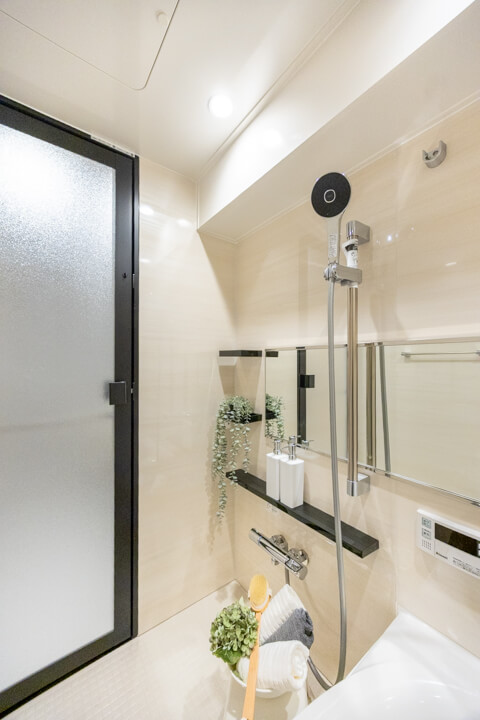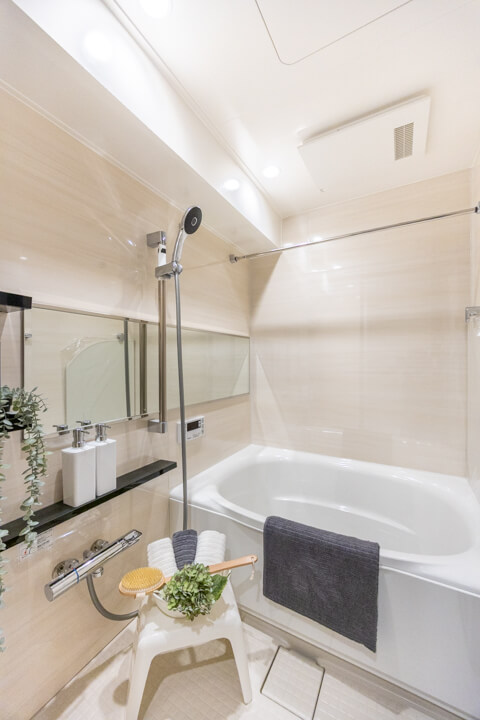 1216サイズのバスルーム。追い炊き機能の他、乾燥・換気・暖房・涼風の4つの機能が備わっていて、一年中快適にバスタイムが楽しめます。ランドリーパイプも付いていて、雨の日や冬場の洗濯にも困りません。