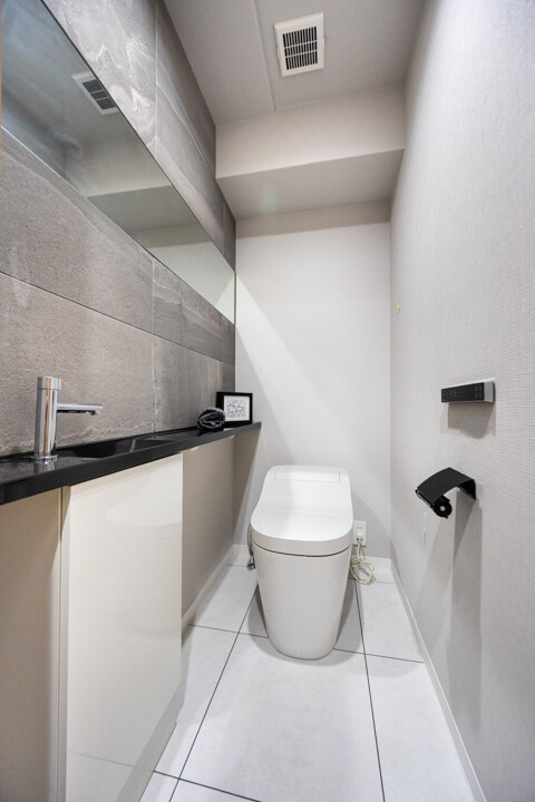 廊下に面したレストルーム。空間がすっきり見えるタンクレストイレです。手洗いカウンター、ウォシュレットも備わっています。
