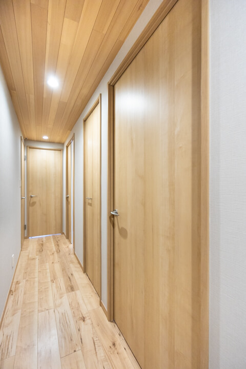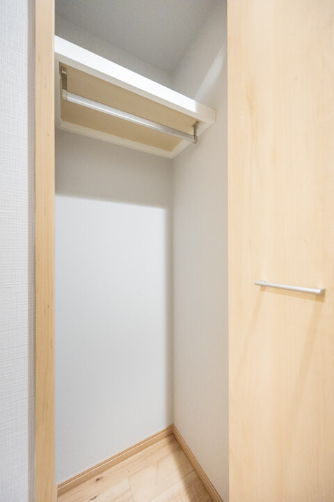 玄関にはシューズボックスを完備。ブーツや高さのある靴もすっきり整頓できる可動棚です。また、廊下にも物入が設けられています。