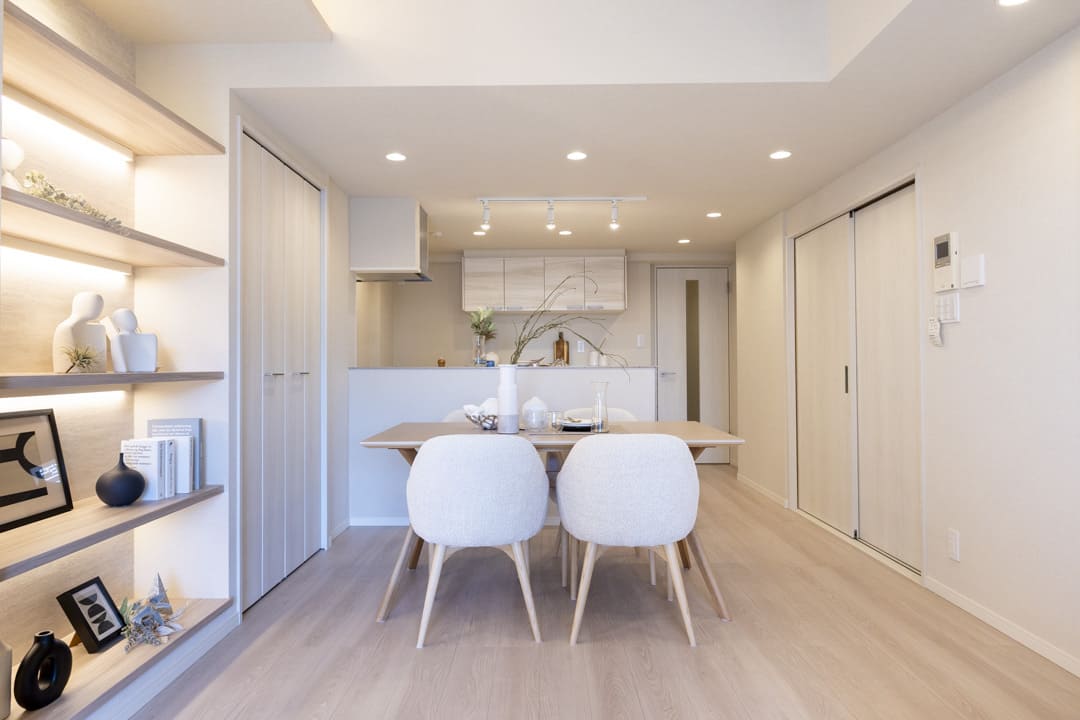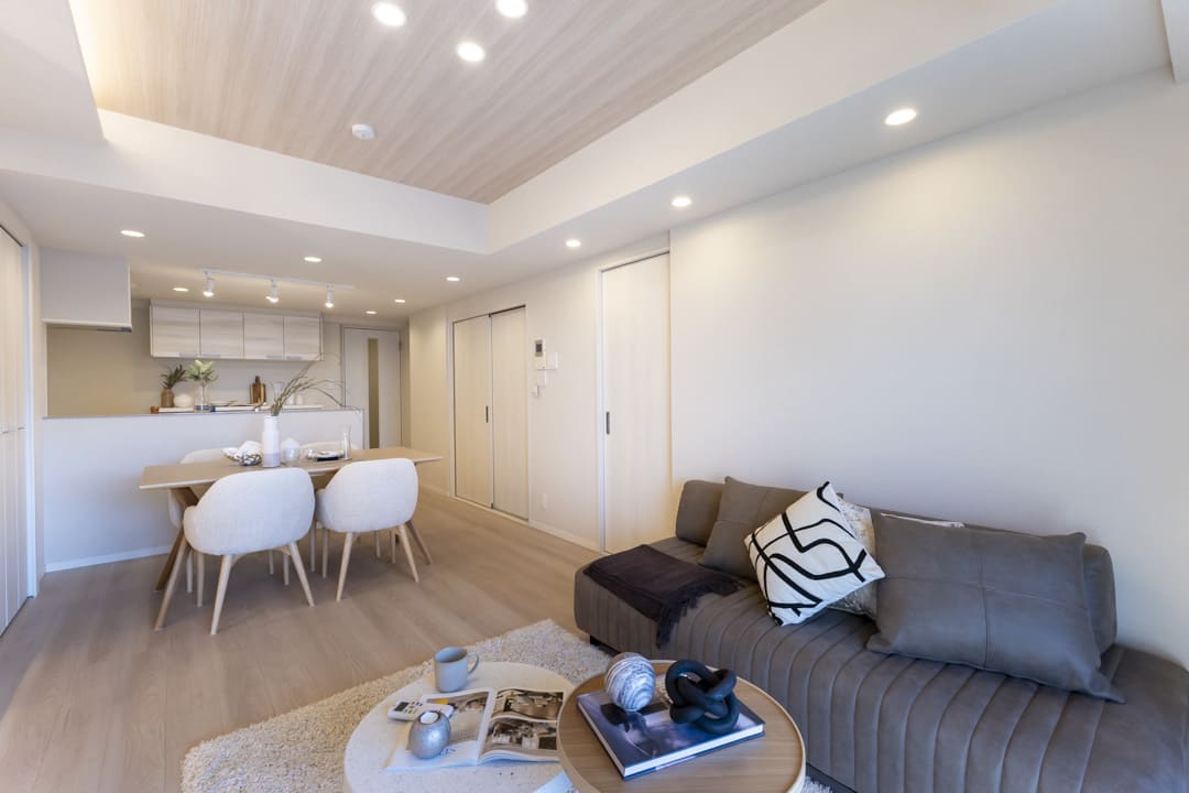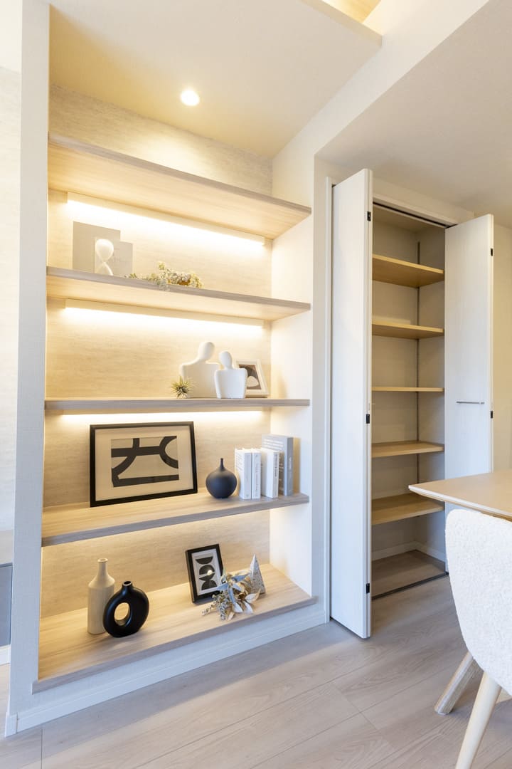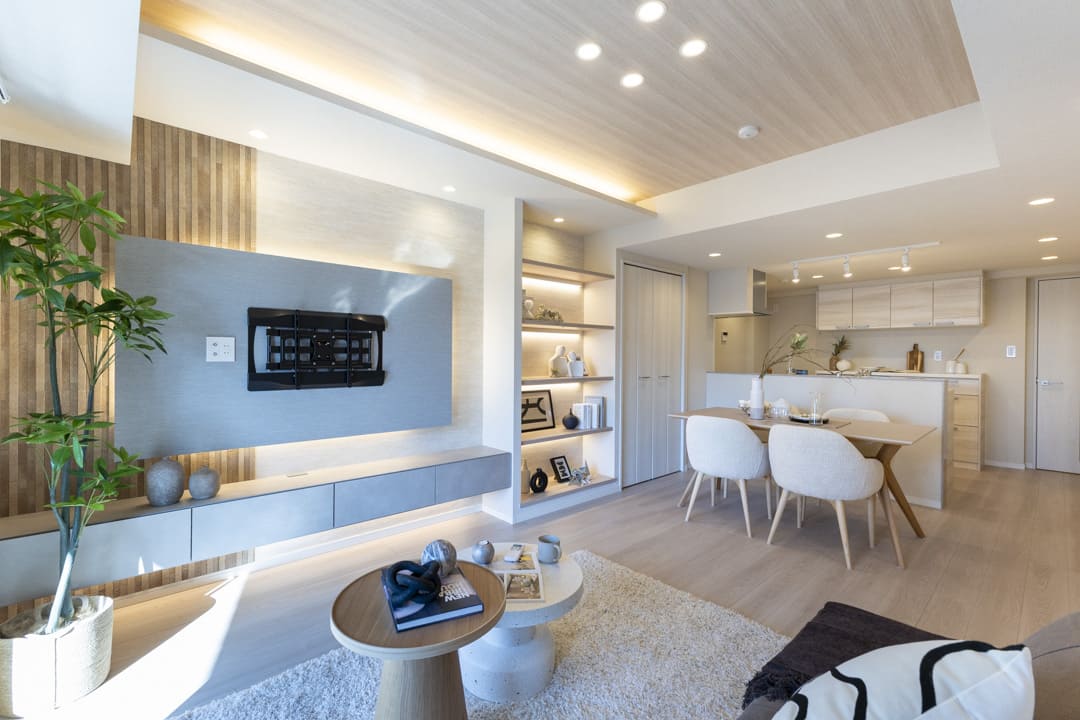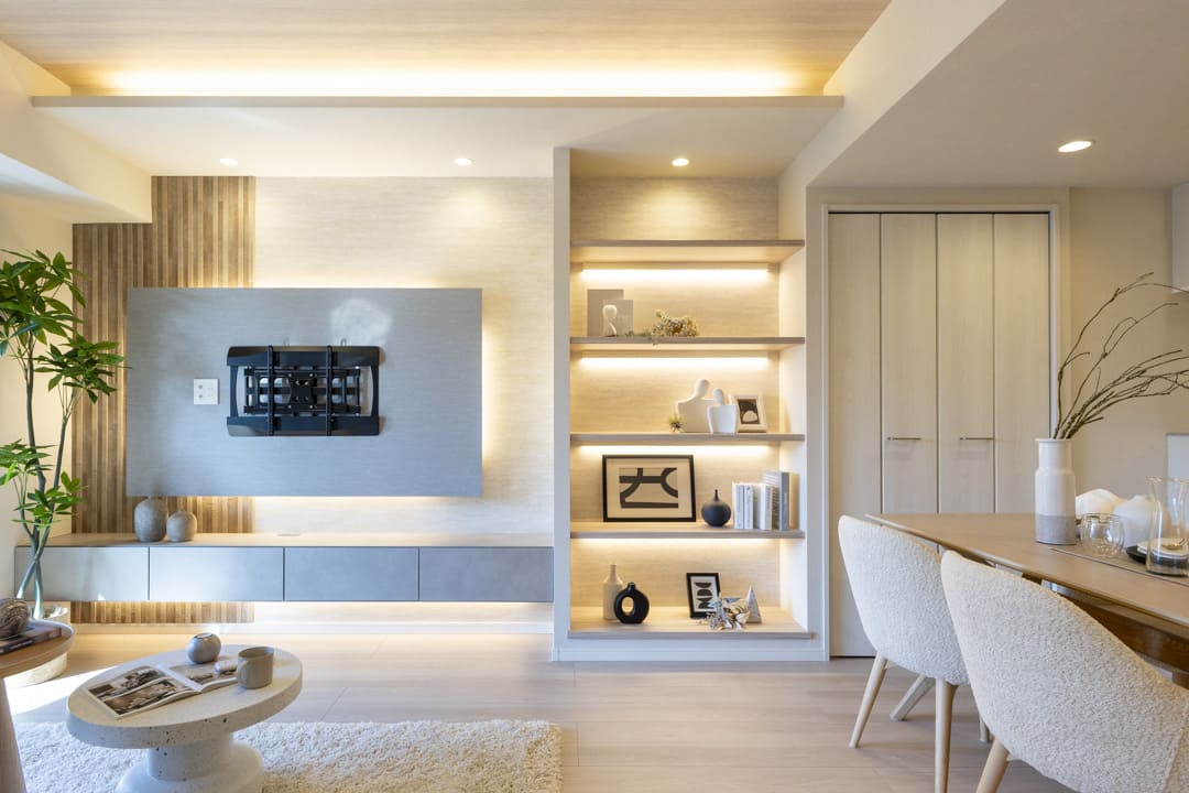 約16.0帖のLDK。南西向きの大きな窓からあたたかい陽光が降り注ぎ、心地よい安らぎの空間が広がります。木目天井と間接照明をアクセントにした、洗練された内装も魅力。飾り棚には小物や植物を並べ、自分好みのインテリアを楽しめます。扉付きの物入も備わっており、見せる収納と隠す収納を使い分けられるのも嬉しいポイント。テレビは壁掛け設置が可能で、空間をすっきりと保てる上、お掃除もしやすい設計です。