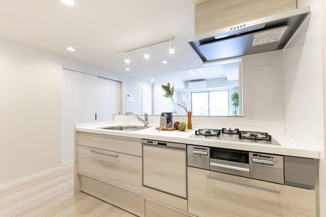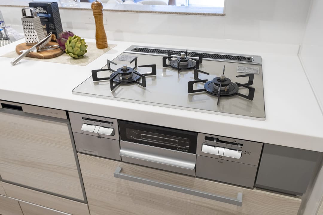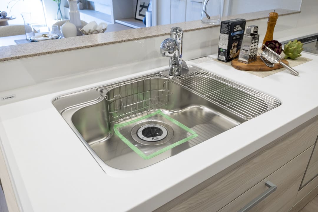 グリル付3口ガスコンロや浄水器一体型水栓、食洗機など、お料理好きの方に嬉しい設備が揃っています。効率良く調理でき、レパートリーも増えそうですね。さらに、シンクにはディスポーザーが付いています。生ごみ処理の手間が軽減され、悪臭の原因を防いでくれますよ。