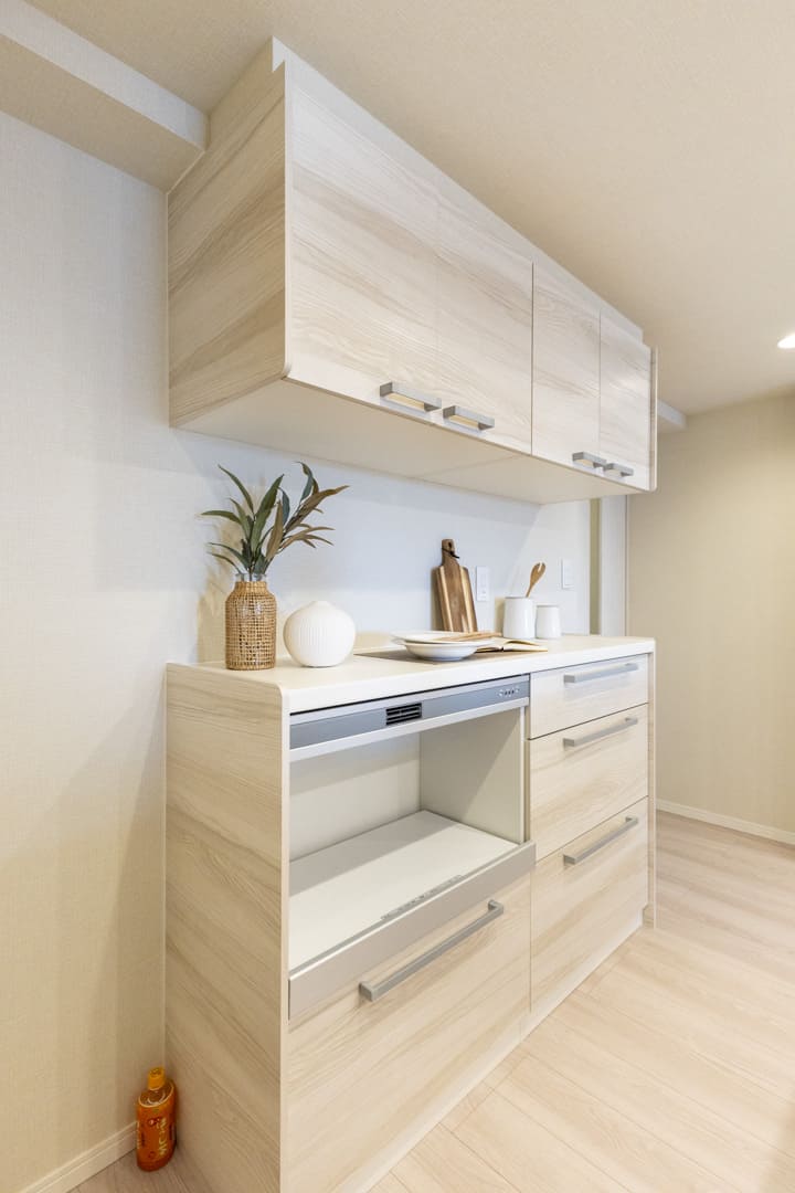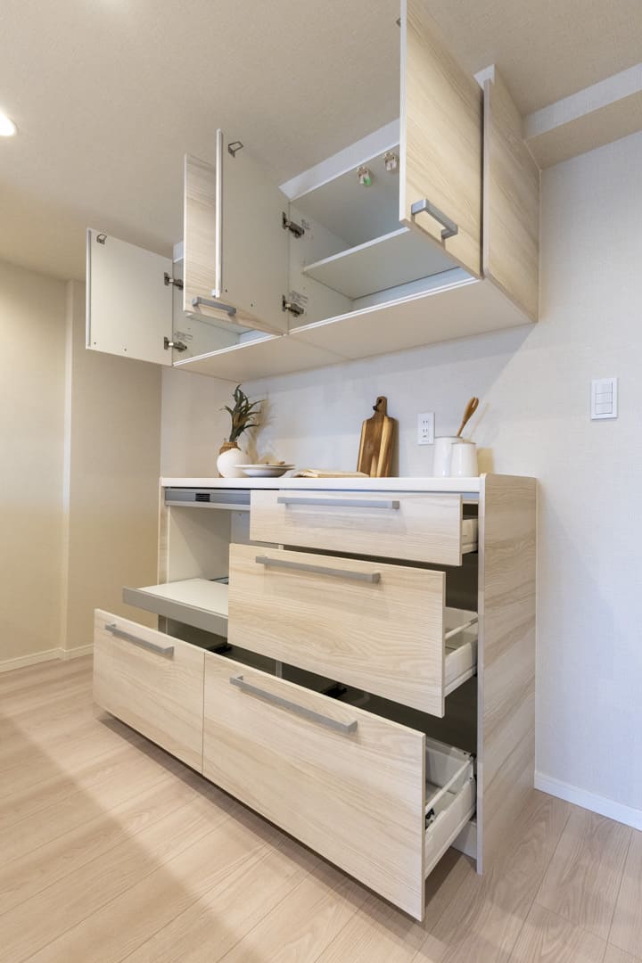 背面には収納力のあるカップボードを完備。キッチンと同じデザインで統一感があります。食料品のストックや食器類を整理整頓でき、散らかりがちなキッチンまわりがすっきり片付きそうですね。蒸気排出ユニット付きで、炊飯器やポットの使用にも便利です。