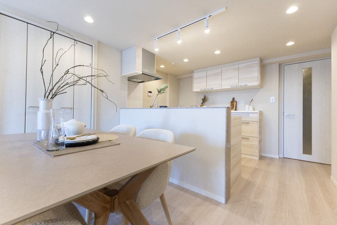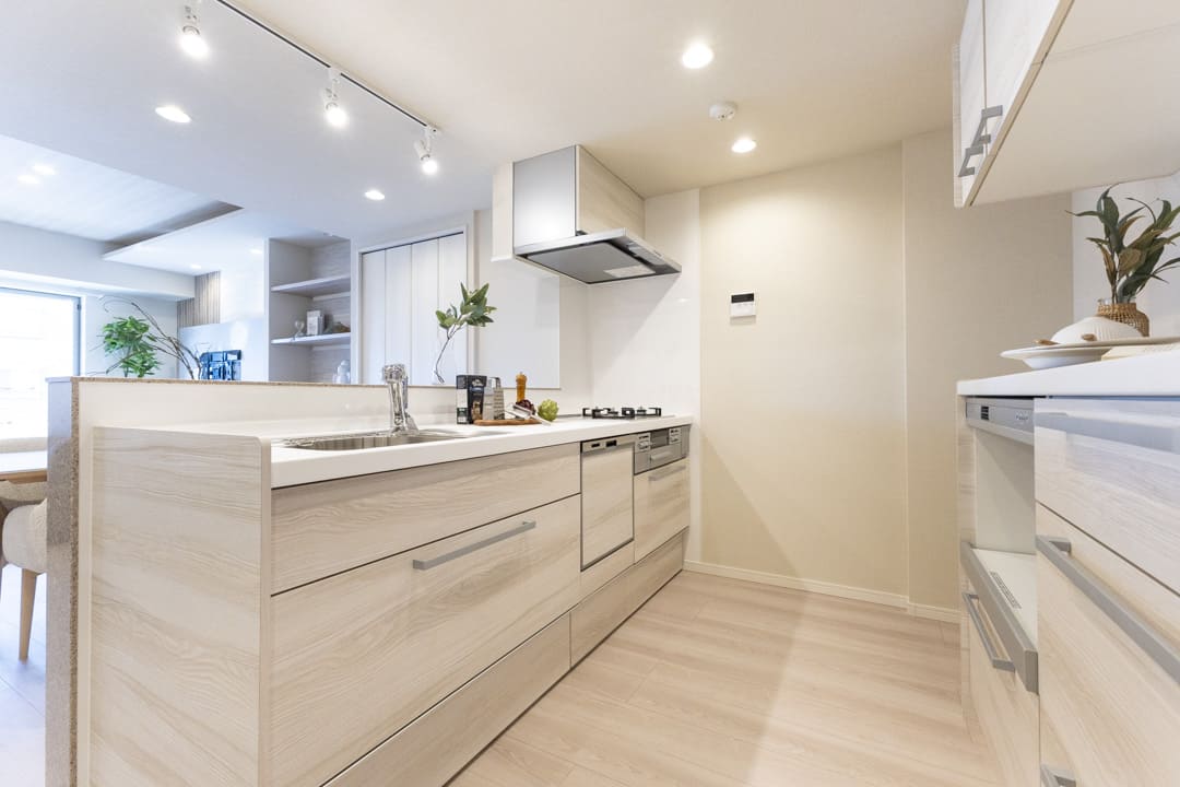 木目デザインが空間に馴染み、清潔感のあるキッチン。リビングダイニングを見渡せる、人気の対面タイプです。パートナーやゲストとの会話を楽しみながら、開放的な気分で調理ができます。立ち上がり壁が生活感の出る手元をさりげなく目隠ししてくれるのも嬉しいポイントです。