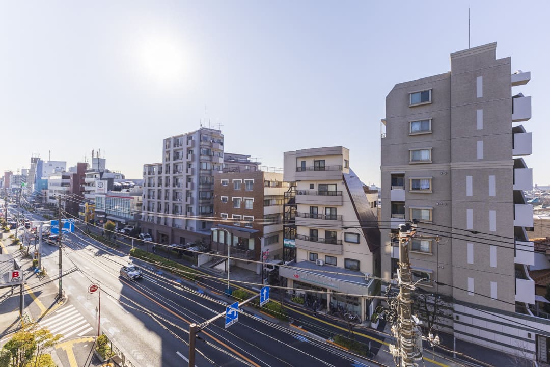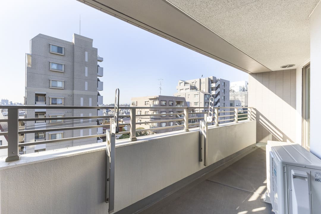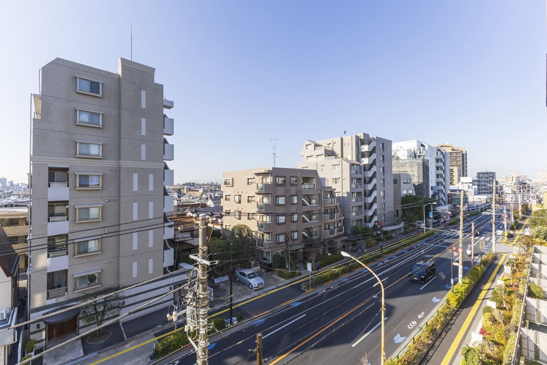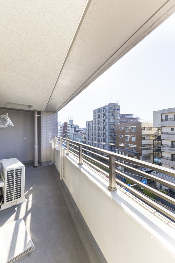 LDKと洋室1に跨るバルコニー。9.97㎡の広々としたスぺースです。南西向きにつき日当たり良好◎。晴れの日には洗濯物がよく乾きそうですね。井の頭通りに面していて、遠く広がる青空を望む開放的な見晴らしです。