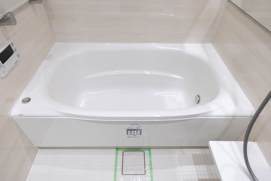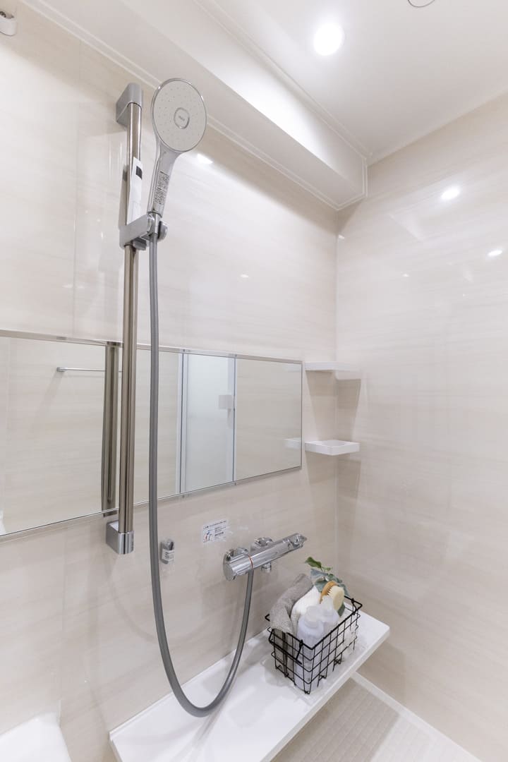 1418サイズのバスルーム。ワイドミラーが奥行きをもたらし、広々とした印象になります。換気・暖房・乾燥・涼風機能付きで1年中快適なバスタイムに。雨の日の洗濯スペースとしても重宝しそうです。お風呂にゆっくり浸かるのが好きという方に嬉しい追い焚き機能も搭載されています。