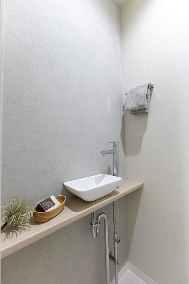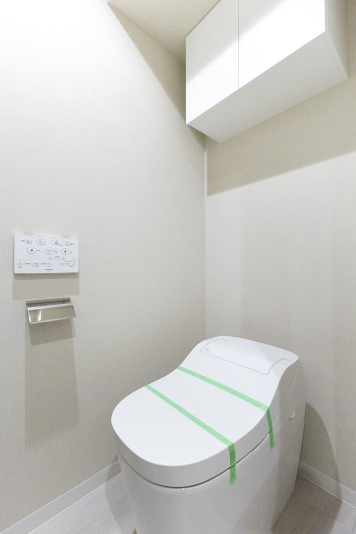 廊下に面していて独立性の高いレストルーム。Panasonic製の洗浄機能付トイレに交換済みです。スタイリッシュな手洗いカウンター付きで、すぐに手を洗うことができて衛生的。ゲストを洗面室まで案内する手間もかかりません。トイレットペーパーや掃除用品は吊戸棚にすっきり収納できます。