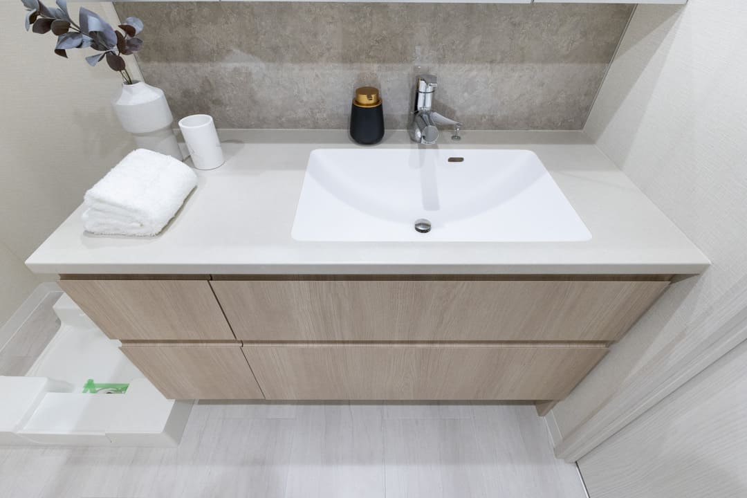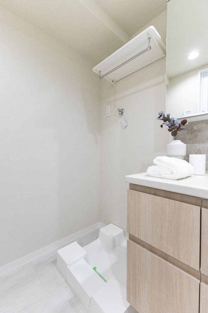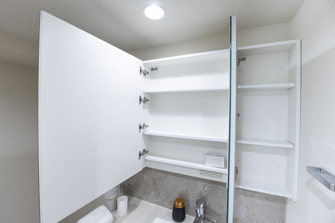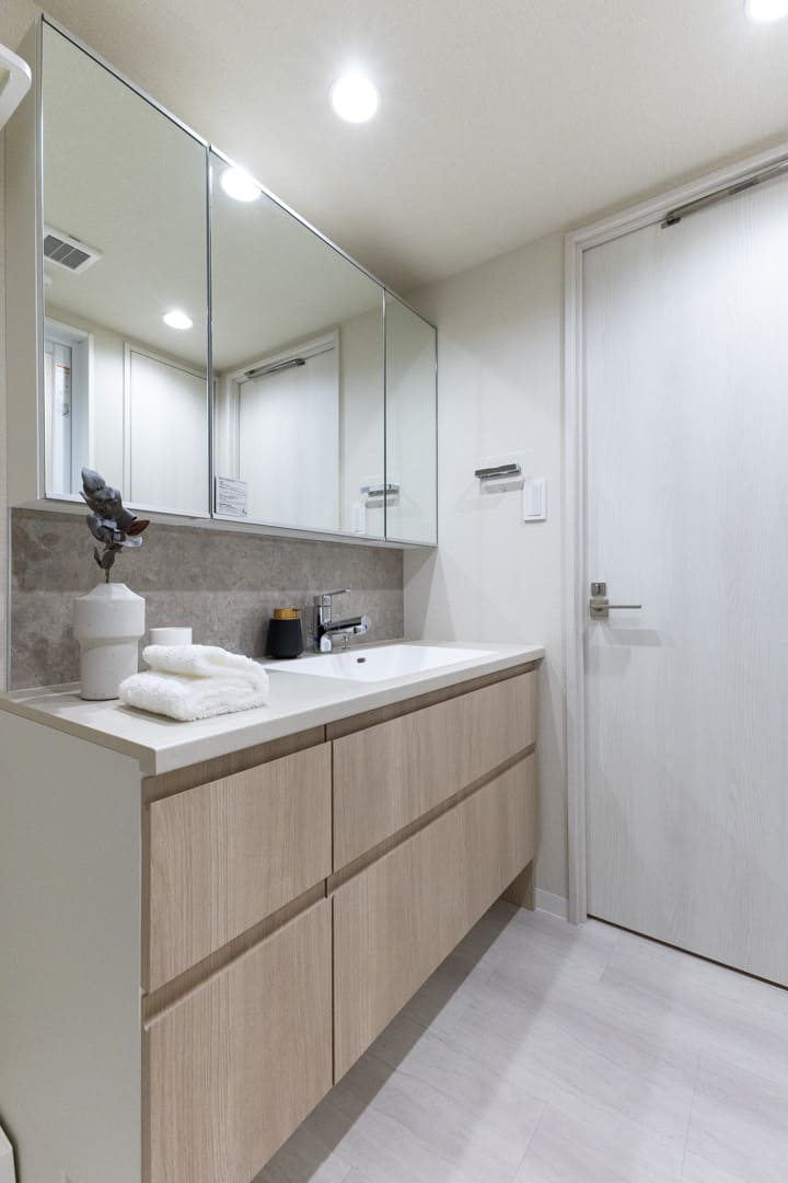 大きな三面鏡が印象的な洗面化粧台。石調のバックパネルが洗練された雰囲気を演出します。洗面ボウルが片側に寄せられていて、カウンタースペースを広く確保。化粧品やドライヤーの仮置きができ、忙しい朝の身支度がスムーズに行えそうです。洗面台本体の収納に加え、リネン庫完備で収納性の高さも魅力です。