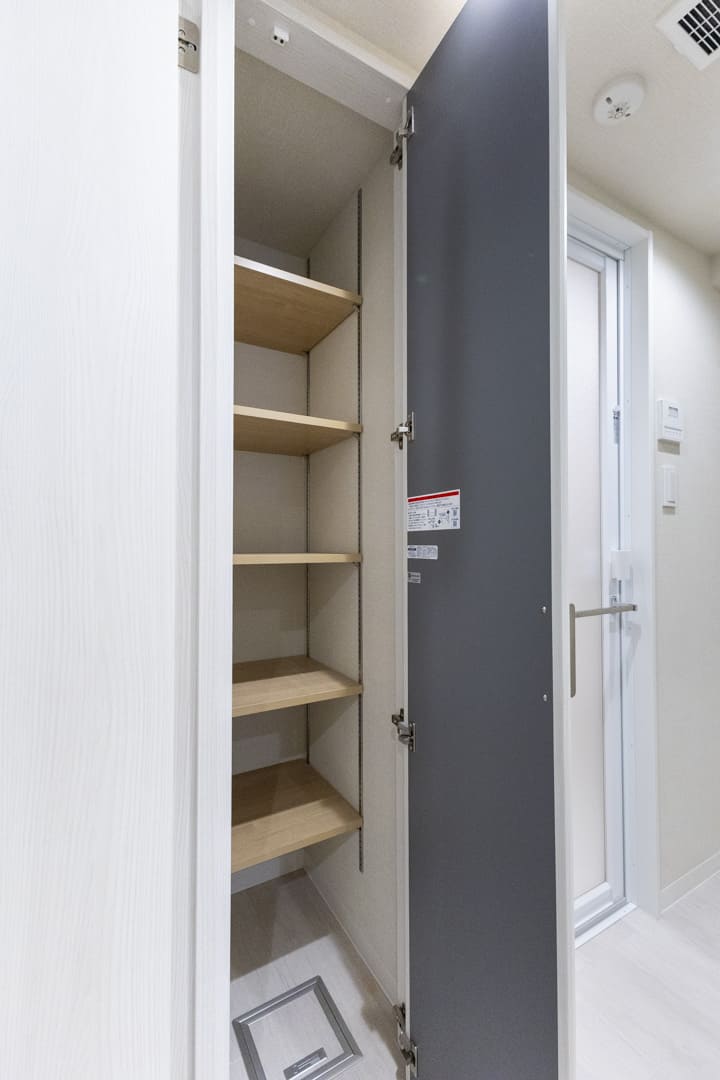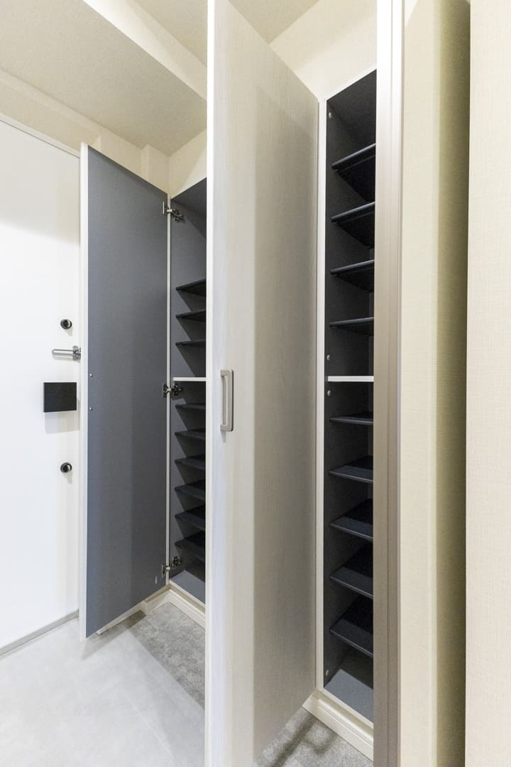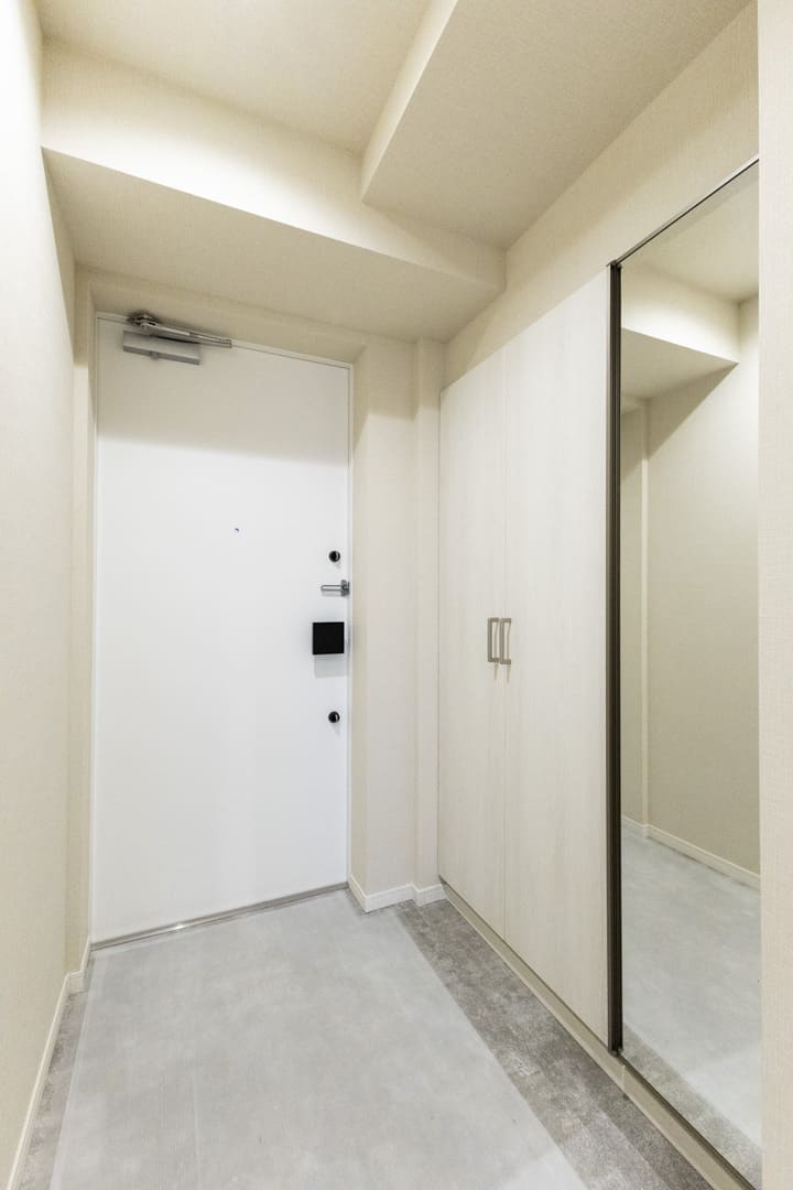 明るい内装で清潔感のある玄関。人感センサー付照明が設置されているので、荷物で両手が塞がっている時や夜遅く帰宅した時に、スイッチを探す手間がかからず助かります。大容量のシューズボックスが備わっていて、散らかりがちな靴をすっきり収納可能。扉の一部が鏡張りになっていて、靴を履いた状態でコーディネートチェックできるのも嬉しいポイントです。