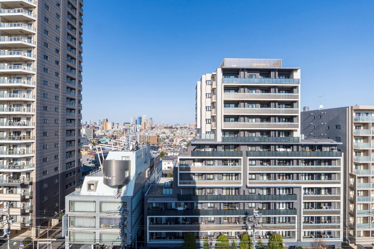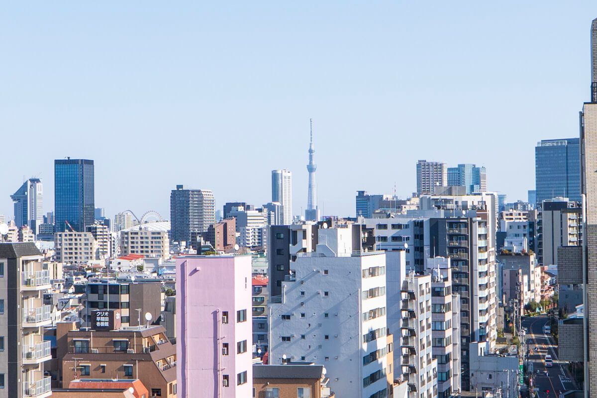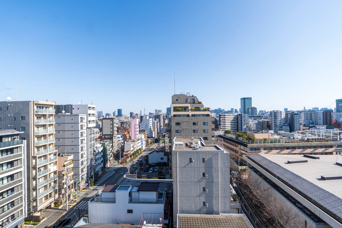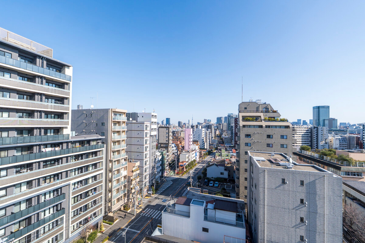 リビングダイニングから出入りできる北東向きのバルコニー。約5.0㎡ほどの広さです。10階部につき眺望良好。東の方角には東京スカイツリーも望めます。