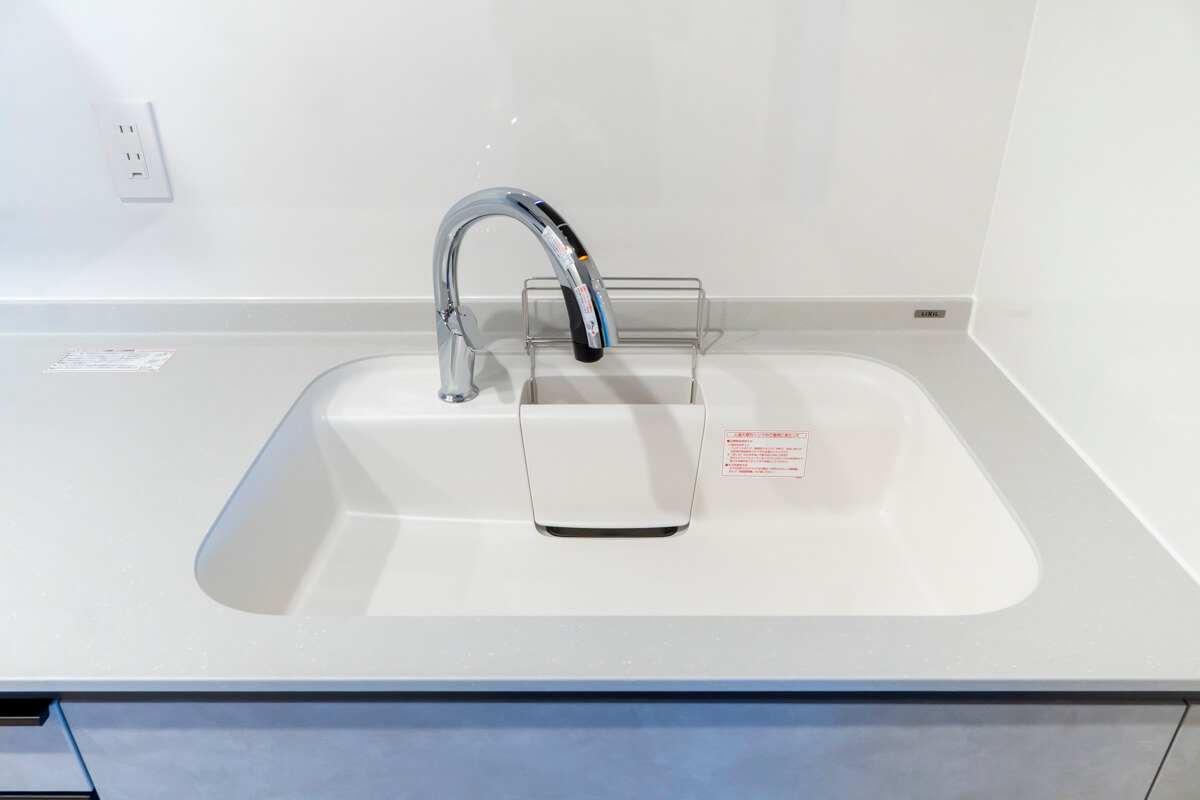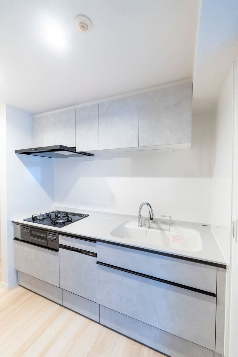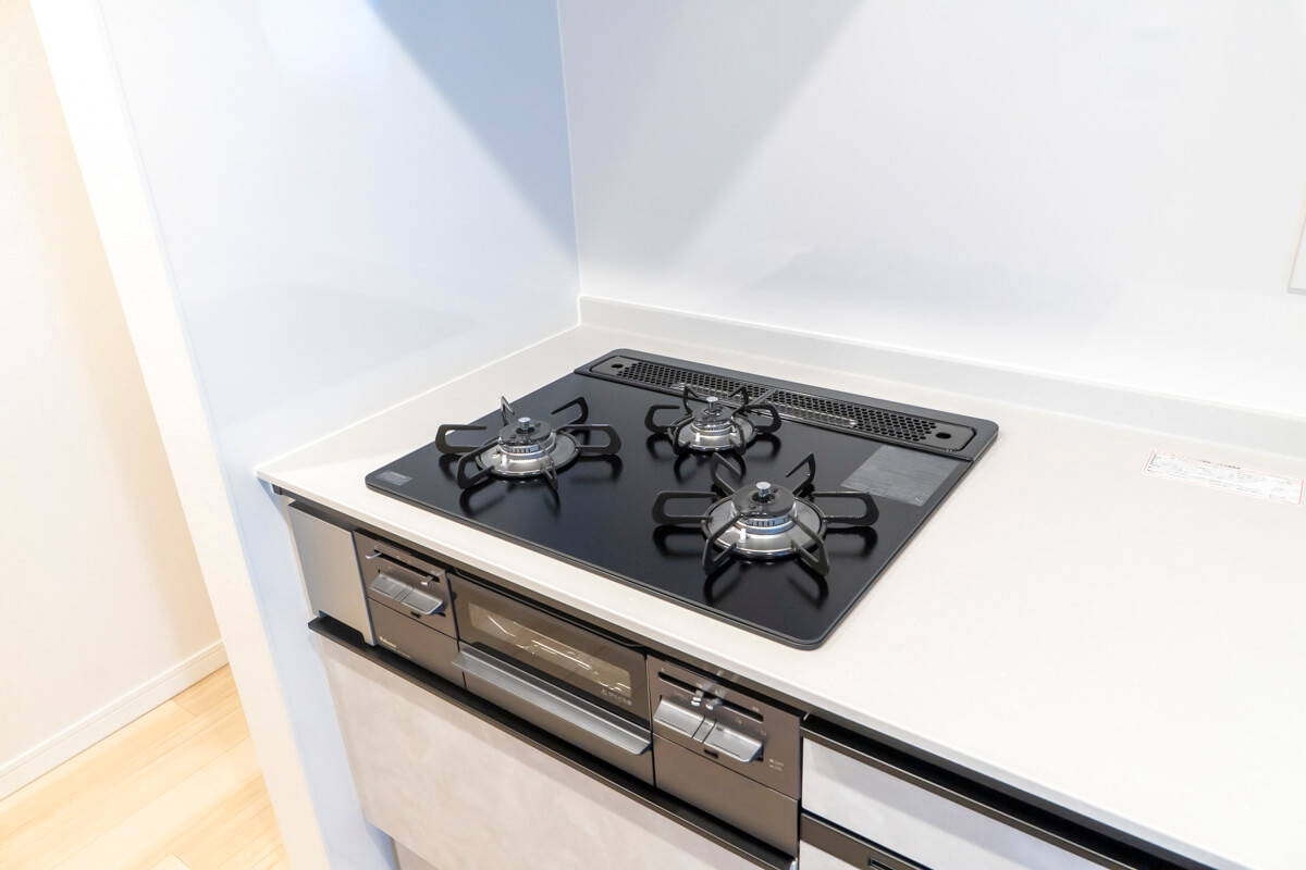 約3.8帖のキッチンスペース。リビングダイニングと空間分けされていて、キッチンまわりの生活感をさりげなく目隠しできます。料理が捗る3口ガスコンロ、家事の時短に心強い食洗機付きです。