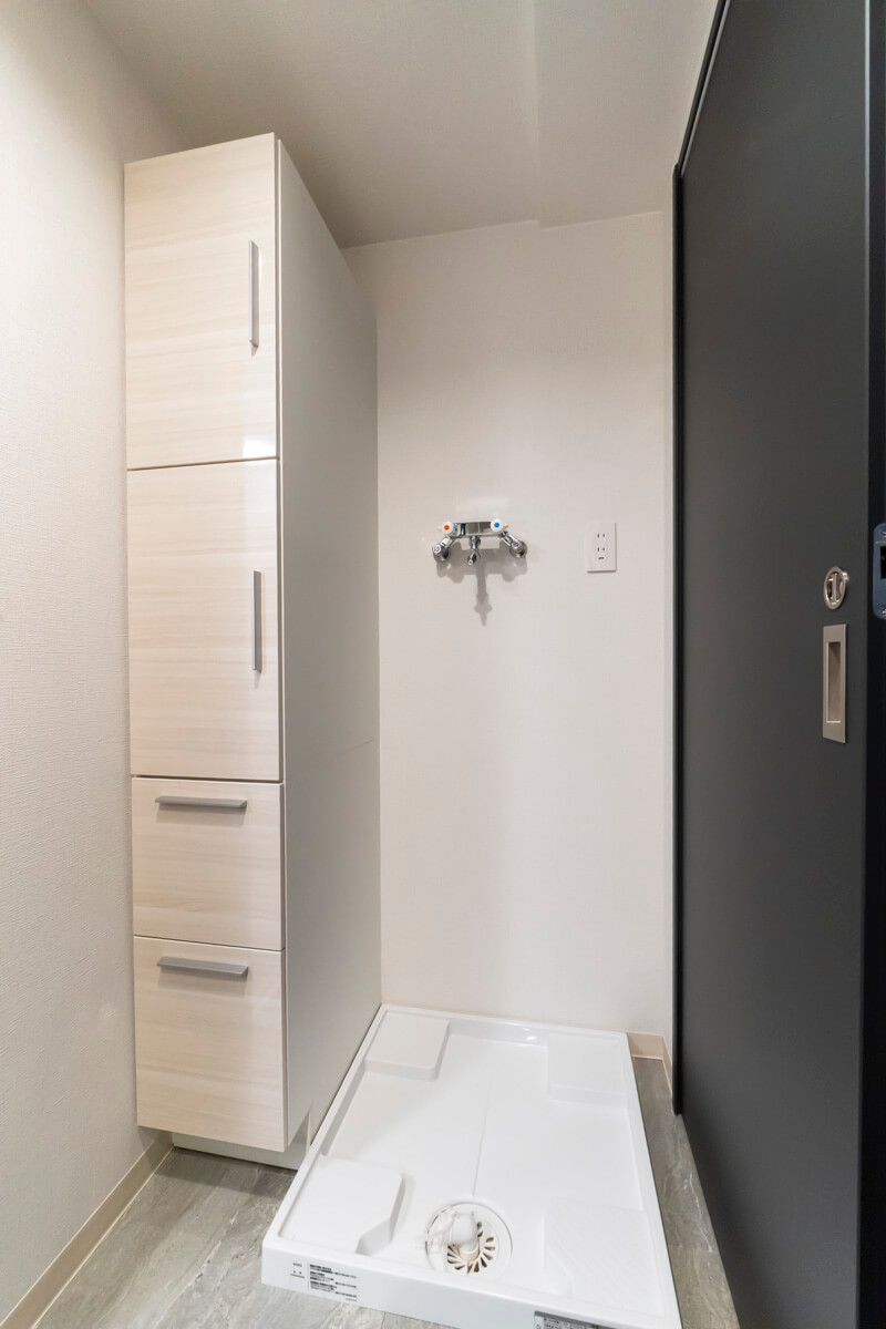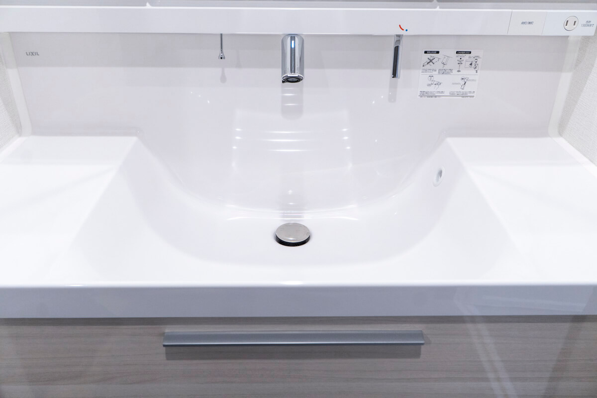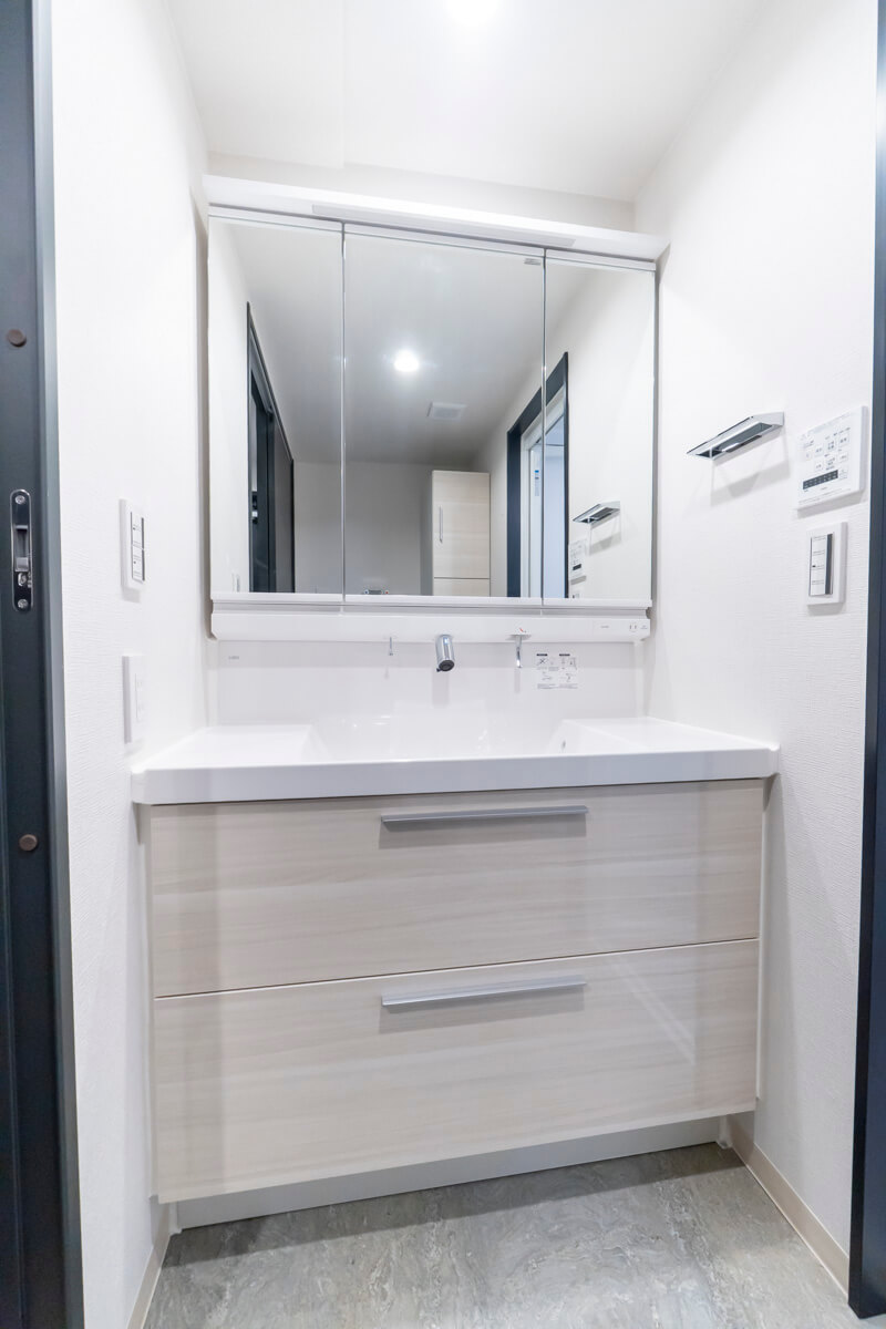 洗面化粧台は洗面まわりの小物がすっきり整頓できるミラーボックスや、モノの出し入れがしやすい引き出し式のキャビネット付きで使い勝手の良さもポイント。洗濯機置き場の左横にはリネン庫も備わっています。
