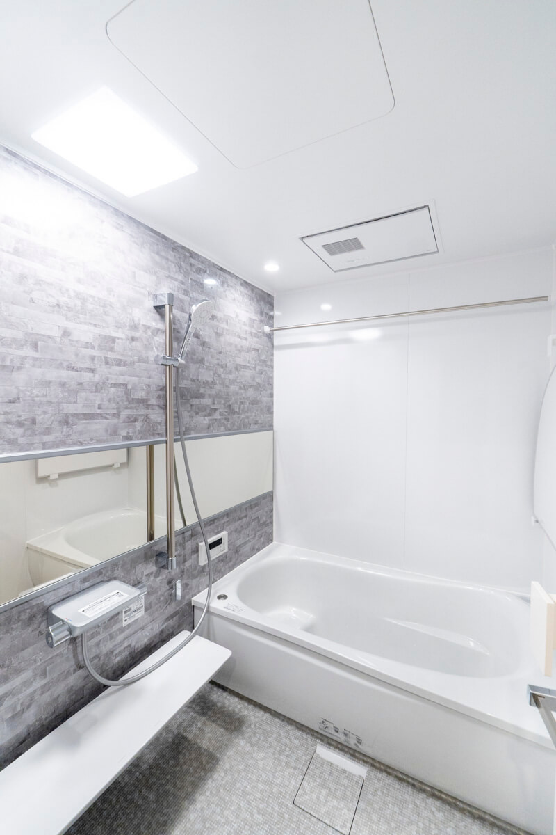 グレートーンで落ち着きのある雰囲気のバスルーム。追い炊き機能の他、浴室換気乾燥機とランドリーパイプ付きで雨の日や冬場の洗濯にも困りません。