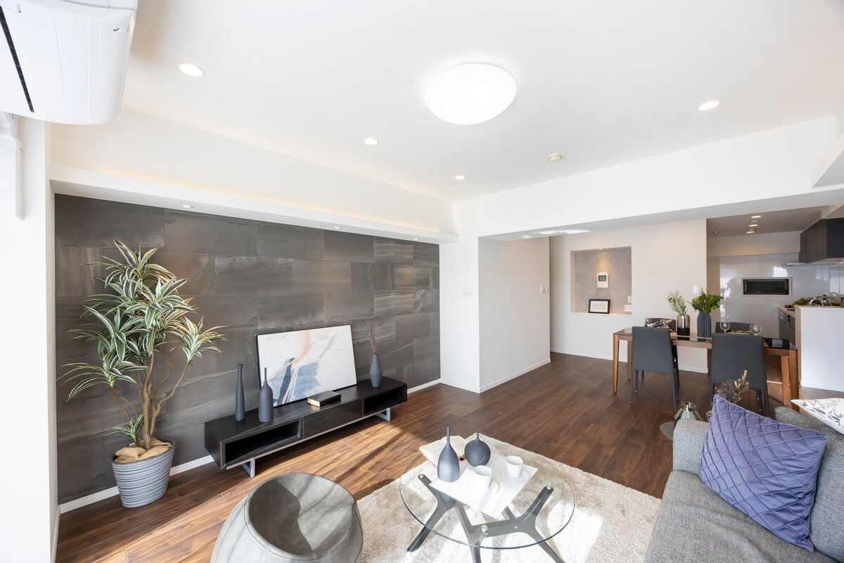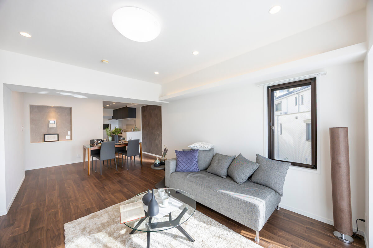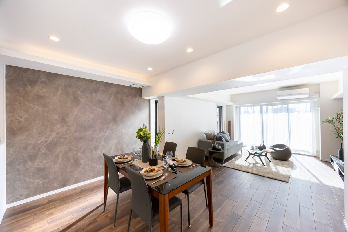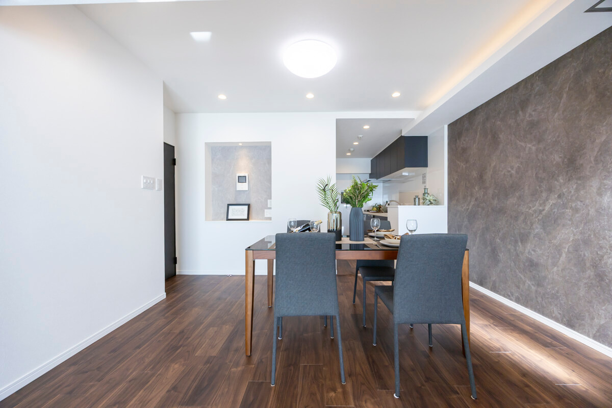 約17.1帖の広々としたリビングダイニングキッチンです。リビングスペースとダイニングスペースとで異なったアクセントクロスがあしらわれていて、空間をさりげなく分けてくれています。また、天井には間接照明も設置されていますよ。ニッチには小物などを飾っても◎。さらに、二面採光で南西向きのため日当たりが良好です。