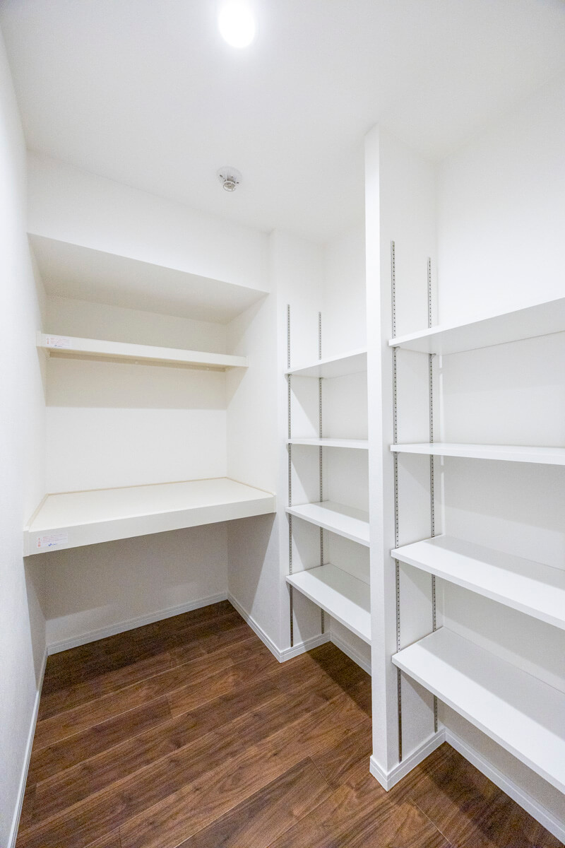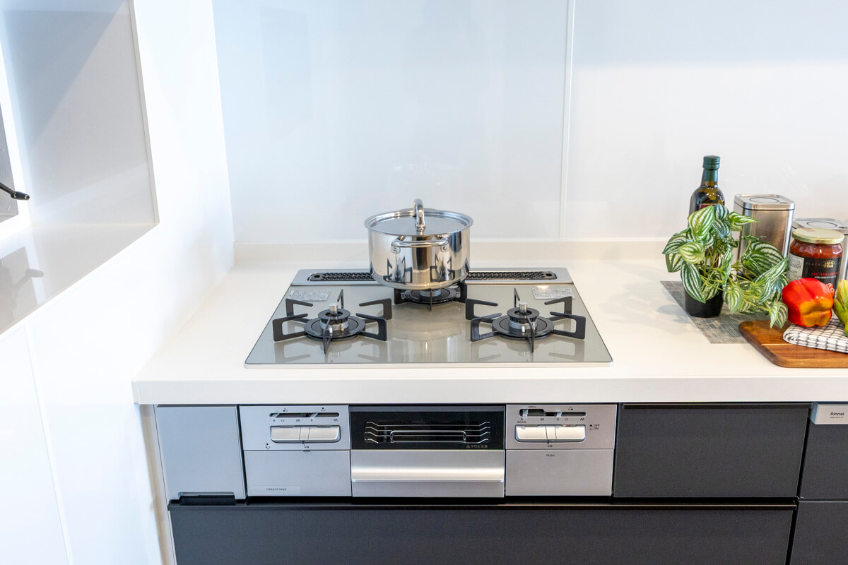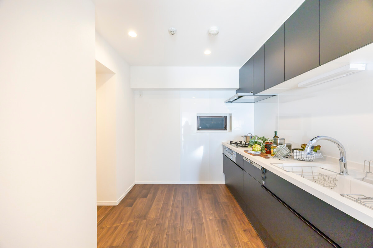 壁付けキッチンは、3口コンロ、グリル、食洗機付きと設備面が充実していて料理が捗りそうです。タッチレス水栓なので、手が汚れていても安心。リビングダイニングからだけでなく、廊下からも出入りができる便利な動線。ストック類などを収納して置ける収納棚にも◎。