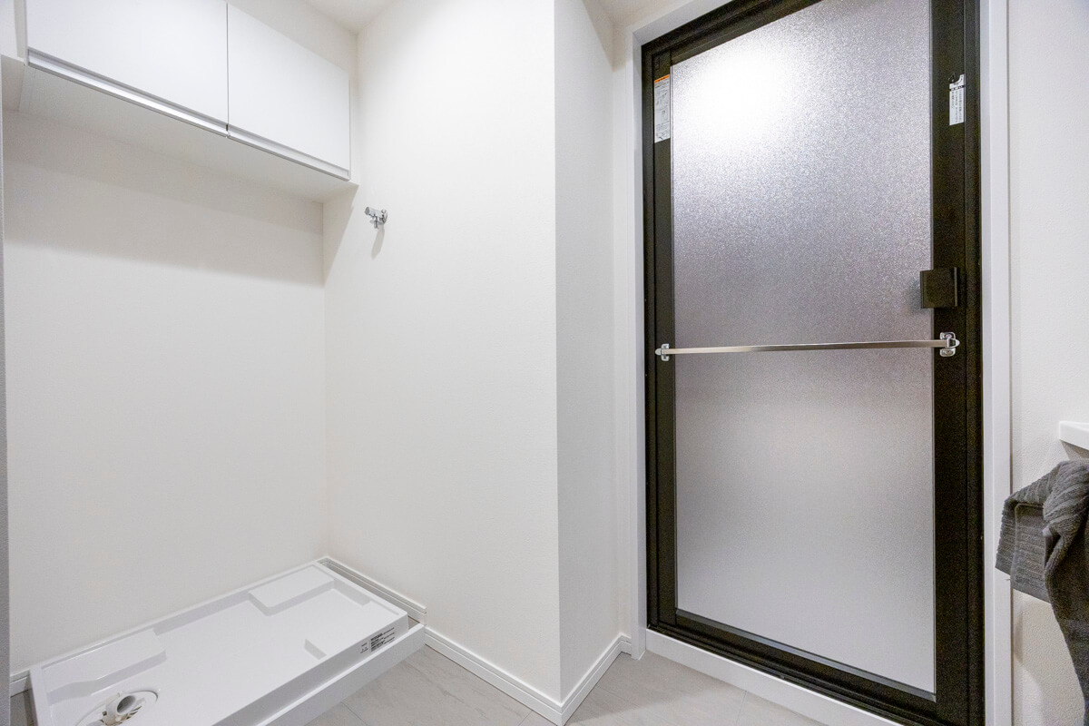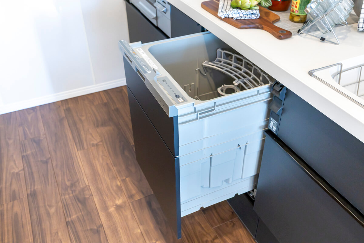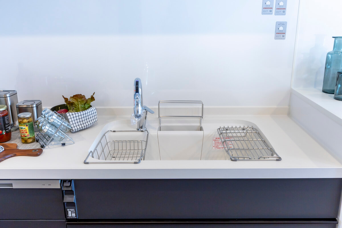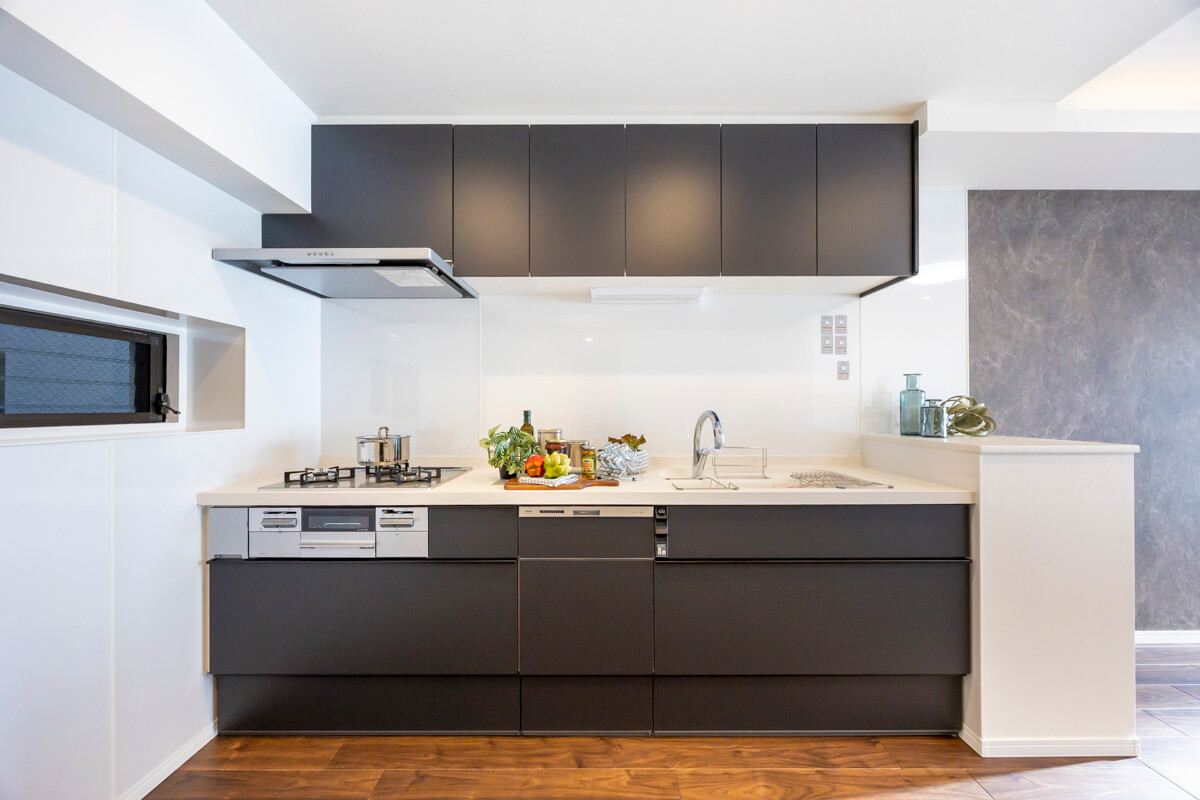 壁付けキッチンは、3口コンロ、グリル、食洗機付きと設備面が充実していて料理が捗りそうです。タッチレス水栓なので、手が汚れていても安心。リビングダイニングからだけでなく、廊下からも出入りができる便利な動線。ストック類などを収納して置ける収納棚にも◎。