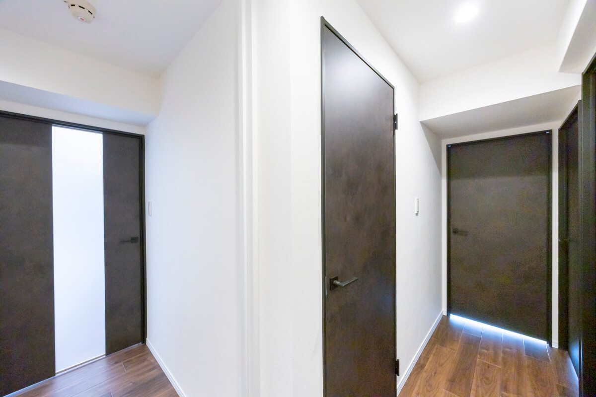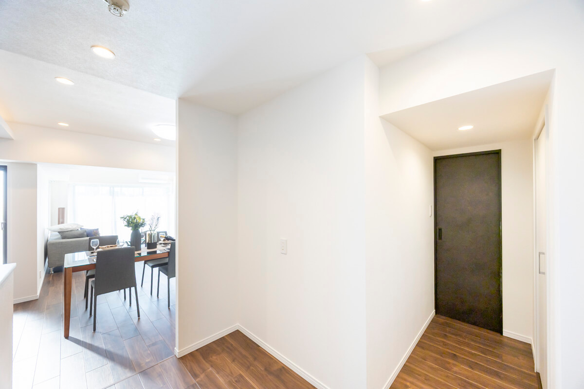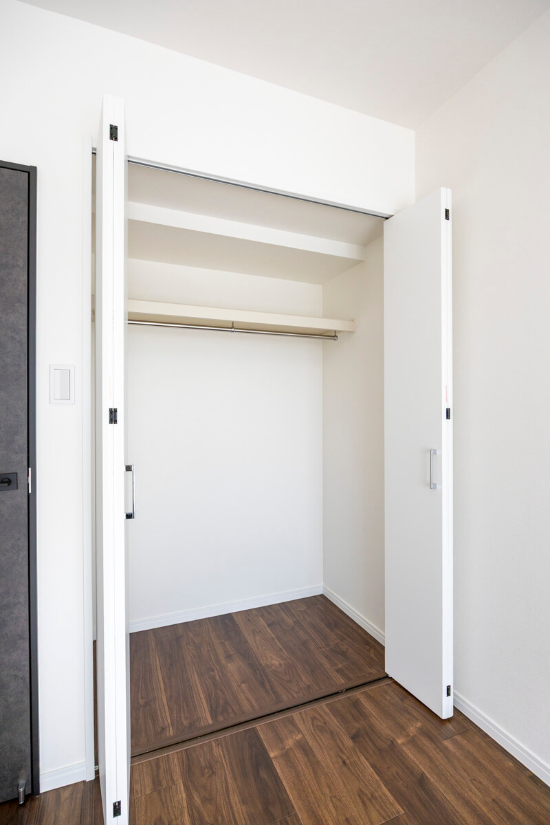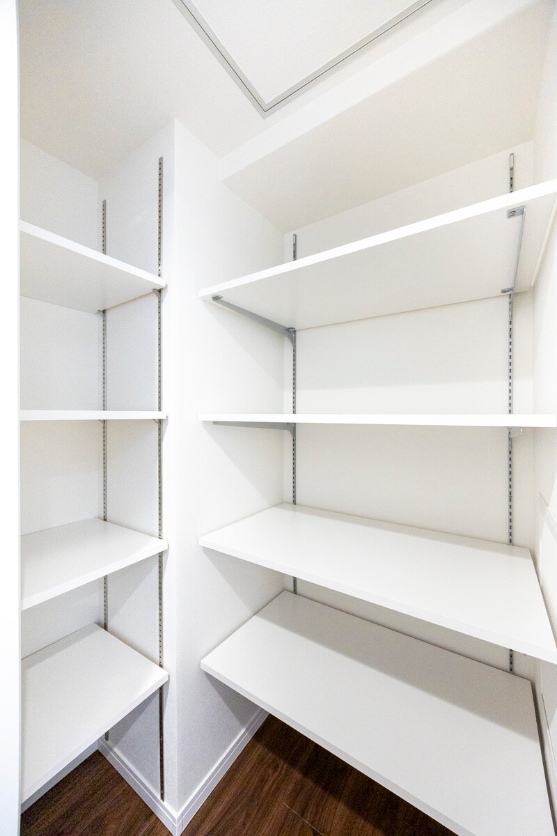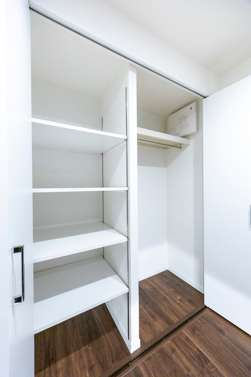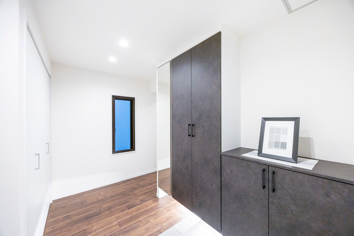 ゆとりのある玄関は、ベビーカーやスーツケースなど大きな荷物を持っていても出入りがしやすそうです。シューズボックスはセパレートタイプのため、靴を収納できるだけでなく、小物やアロマなどを飾ることができますよ。また、玄関収納や居室側の廊下にはシーズンオフの荷物や家電も収納できる納戸が造られています。