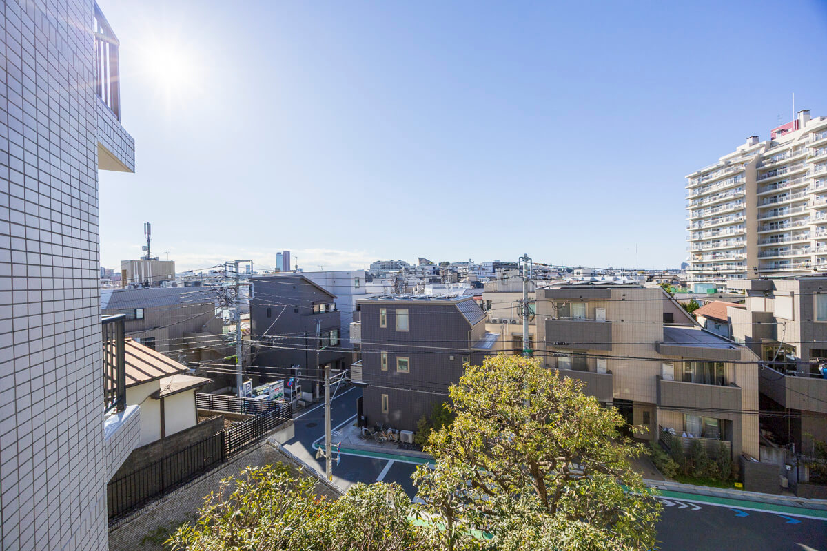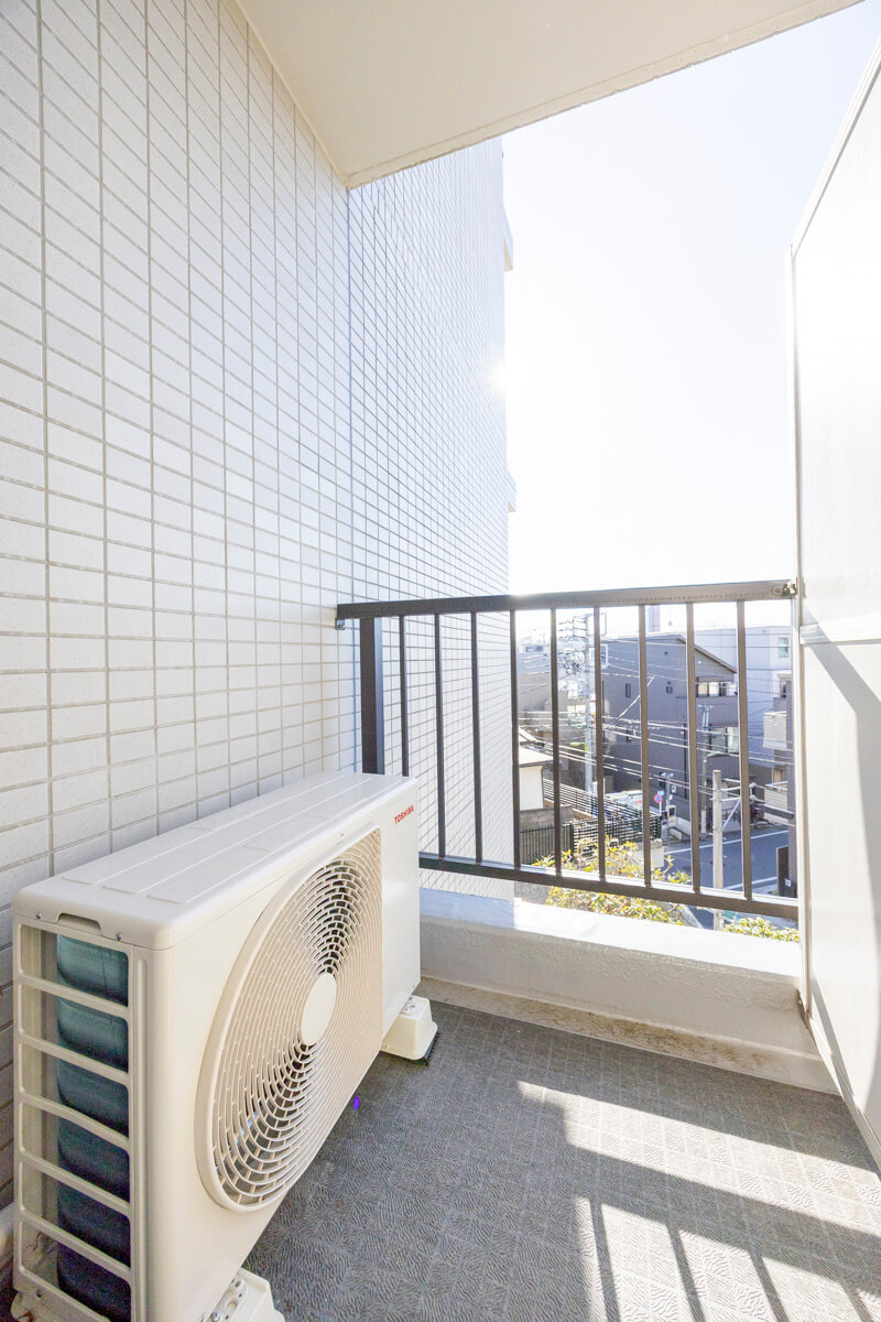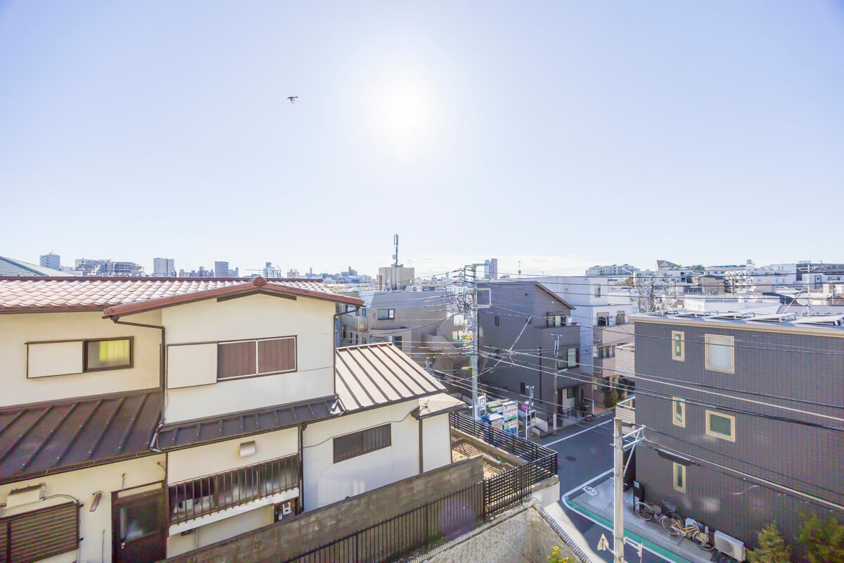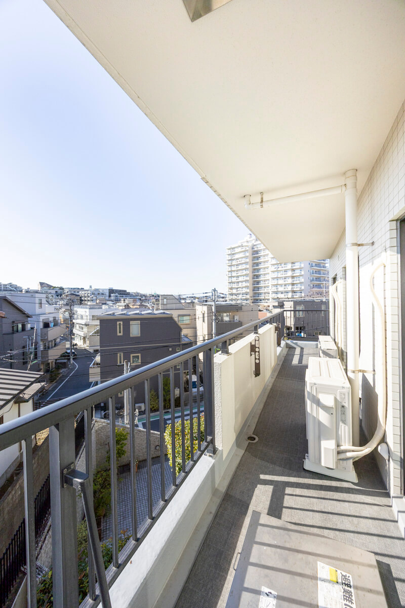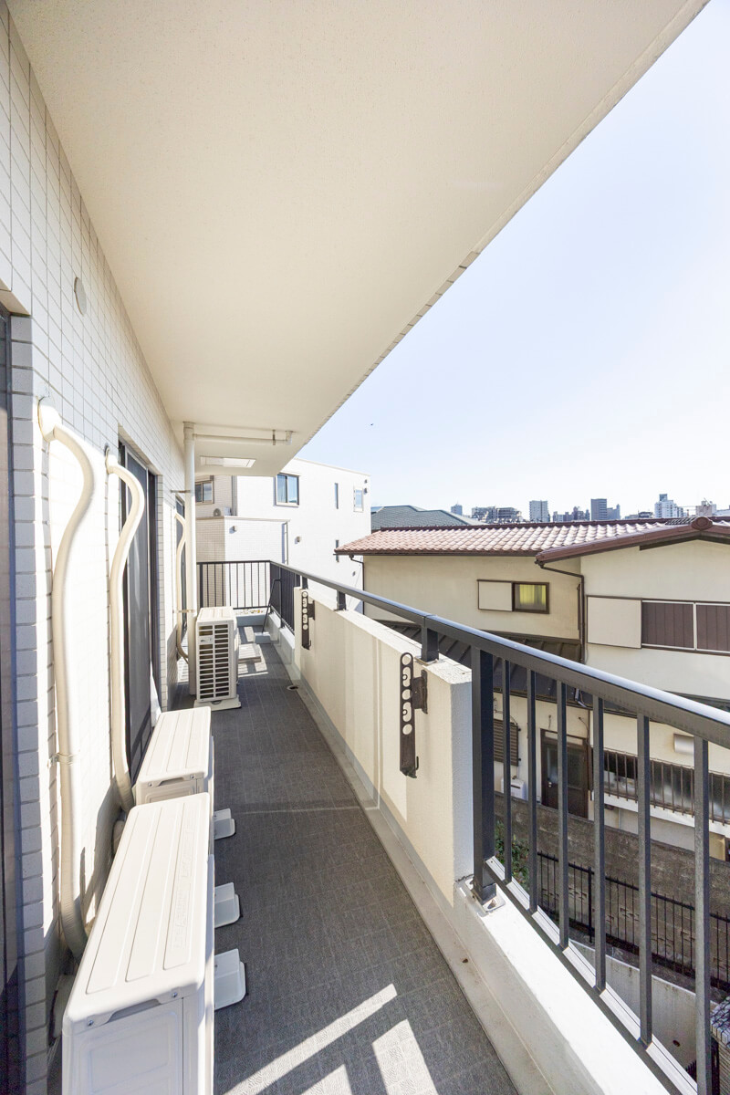 南西向きで日当たりが良好なバルコニーです。LDKと洋室2・洋室3の3ヶ所から出入りができる便利な動線。目の前には高い建物がなく、抜け感のある眺望が広がっています。