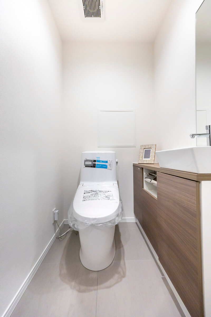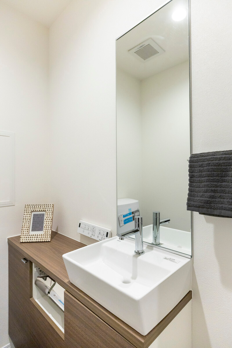 ウォシュレット一体型のトイレです。タンクレスタイプなのですっきりとした印象に。また、別途で手洗い器と鏡が造られているので、すぐに手を洗うことができて衛生的です。カウンタースペースにはアロマなどを置いても◎。
