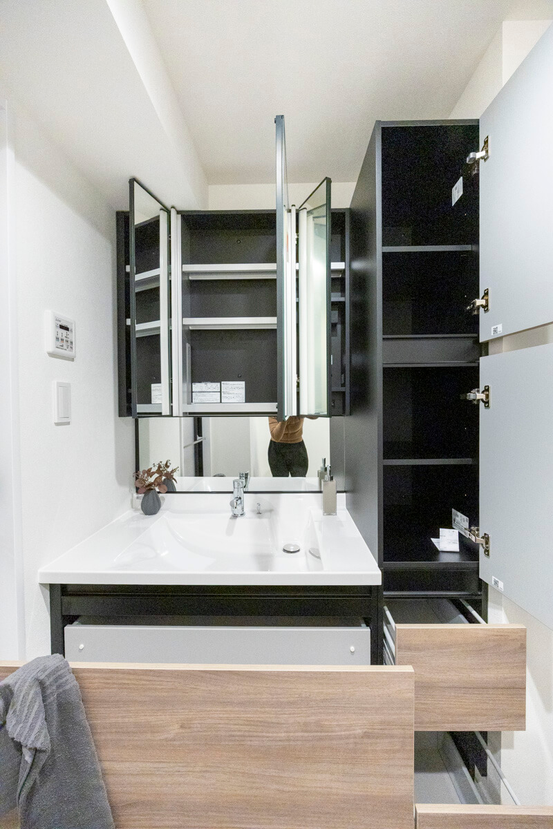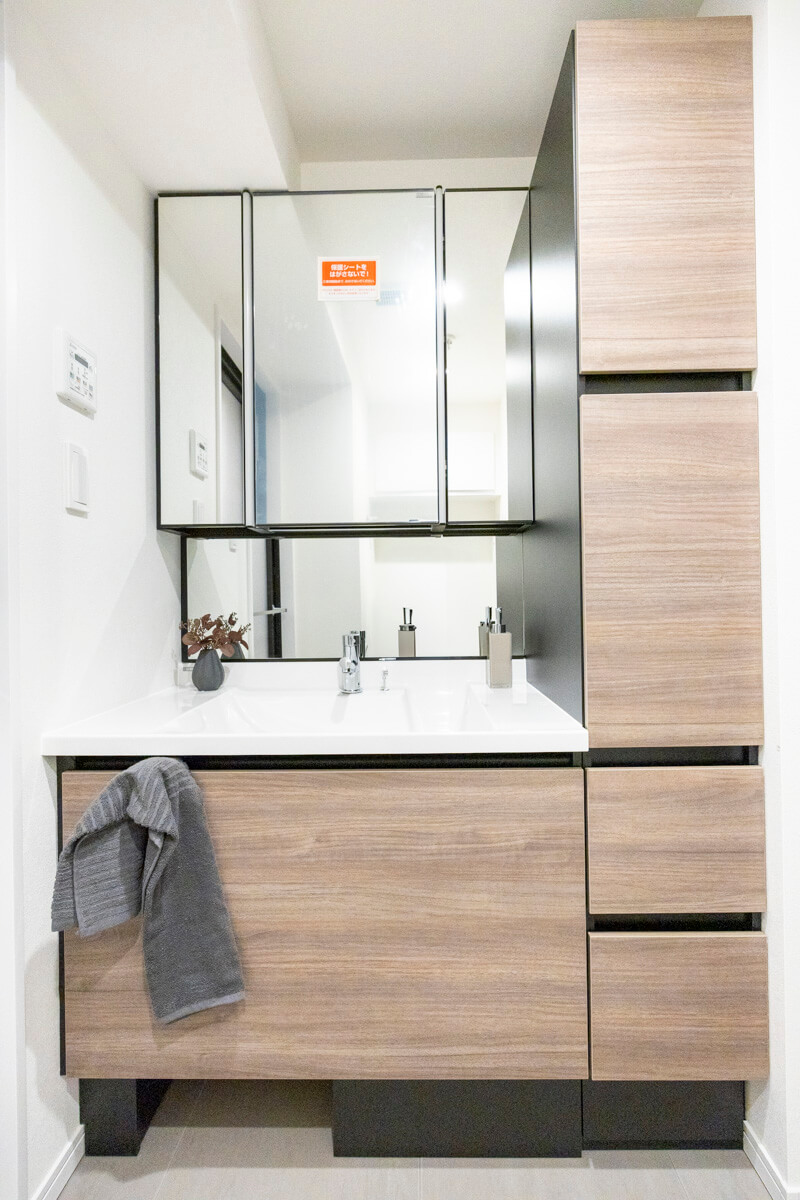 ブラックフレームがアクセントになっていてデザイン性が◎。三面鏡は中に化粧品などの小物が収納できるようになっているので使い勝手良好です。また、洗面ボウルとカウンターが一体型になっているのでお掃除も簡単。