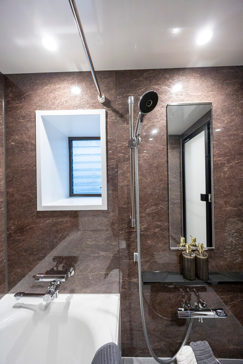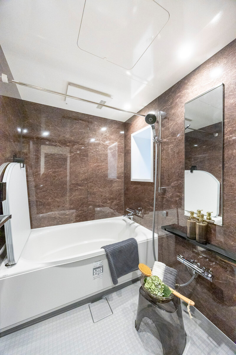 ダークトーンで重厚感のあるバスルームです。浴室乾燥機には暖房・乾燥・換気・涼風の機能がついており、一年中快適に過ごすことができます。また、窓もあるので、自然換気もしやすくなっています。