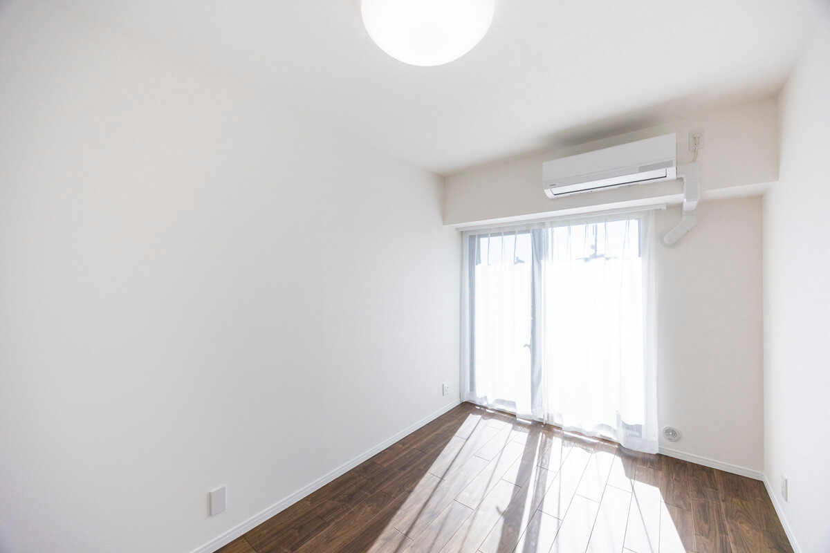 約5.9帖の寝室2は、独立性があって子ども部屋に使えそうな空間です。パイプハンガーが設置されているので、洋服なども収納しやすくなっています。南西向きの窓からはバルコニーにアクセスができ、日当たりも良好です。