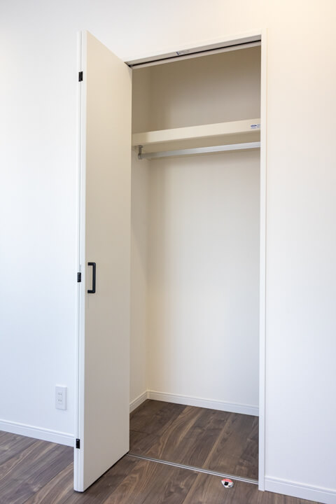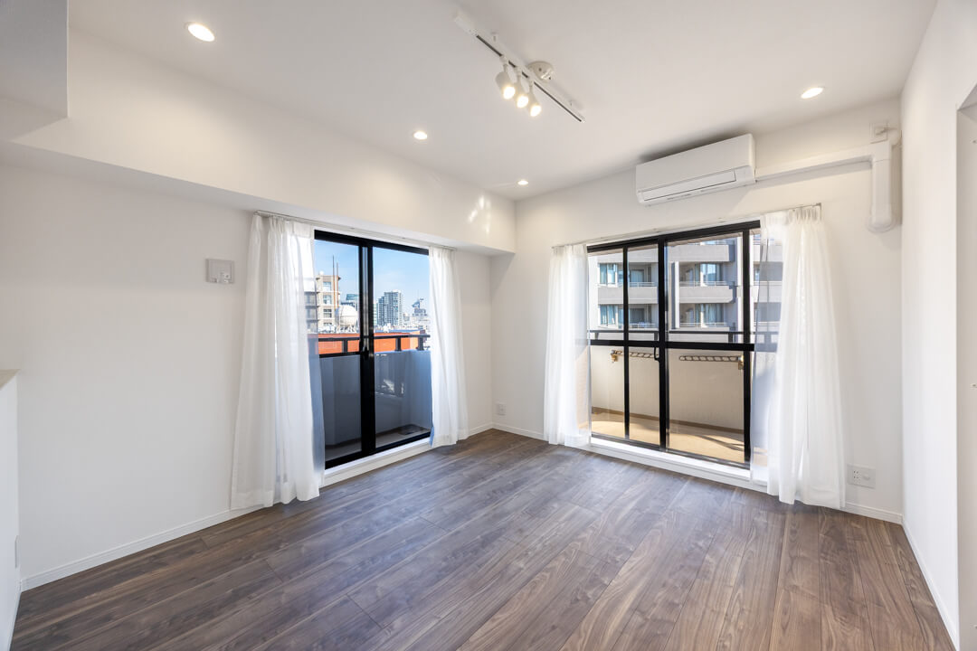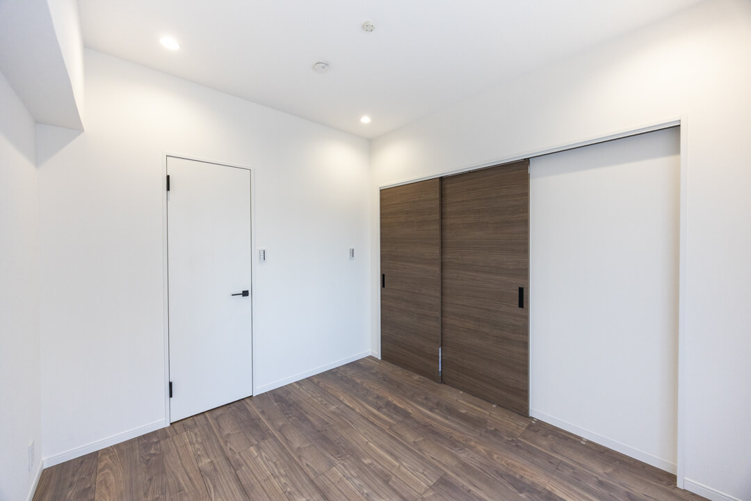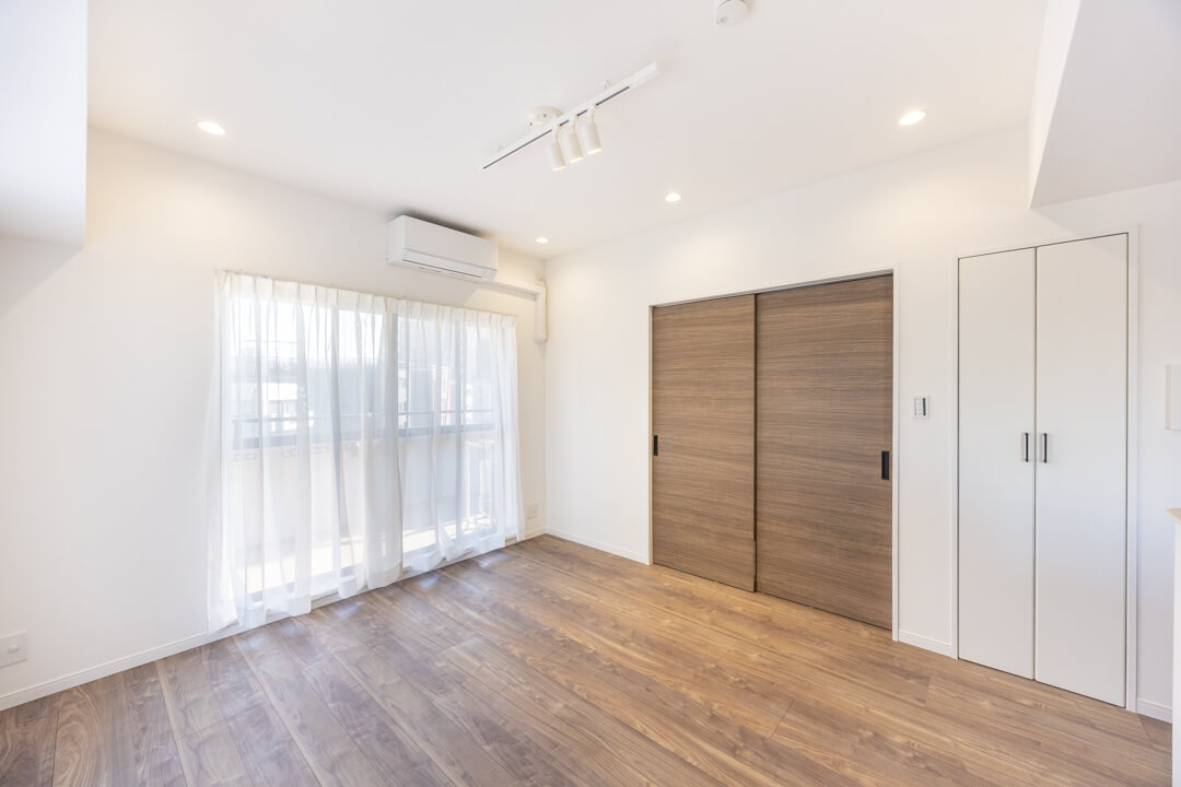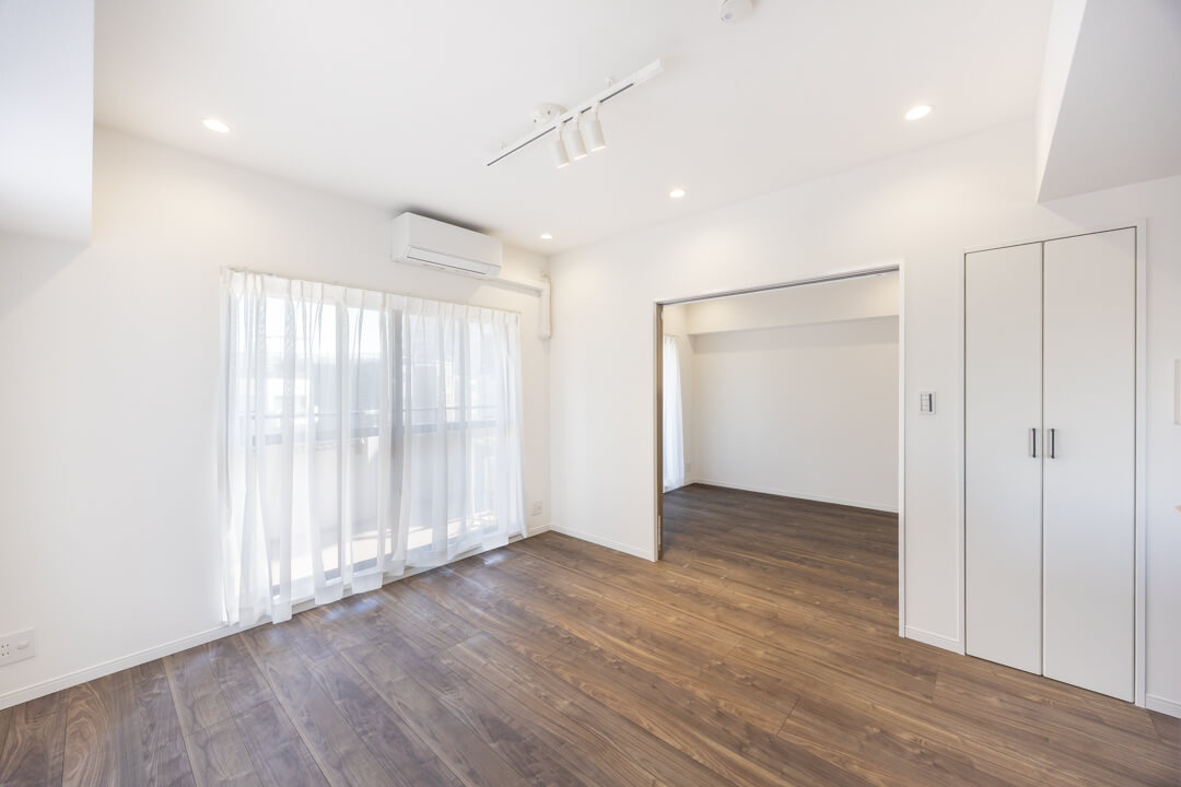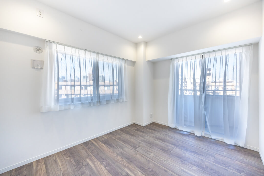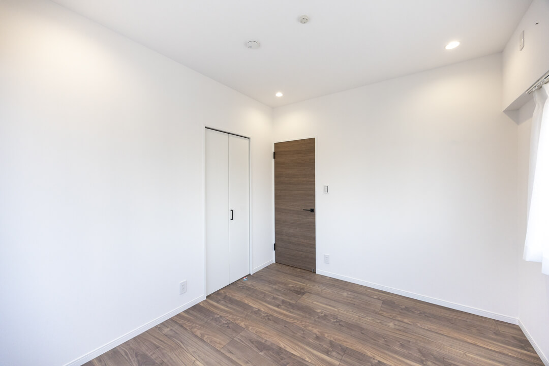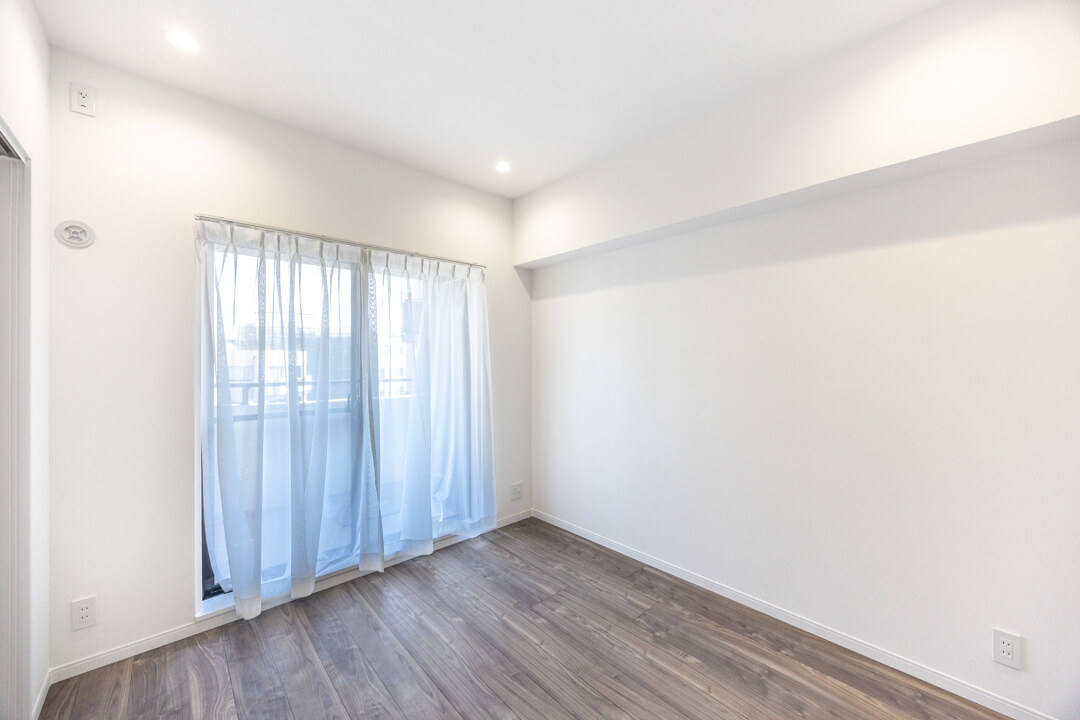 約6.00帖の洋室2。廊下に面した独立性の高いお部屋で、自分時間をゆっくりと過ごせます。二面採光で自然な光が入る開放感のある空間。バルコニーへの出入りも可能です。クローゼットも備わっています。
