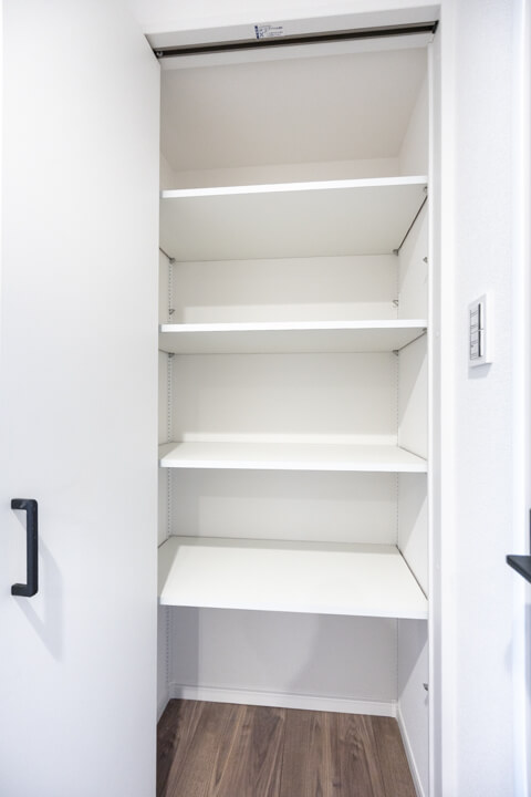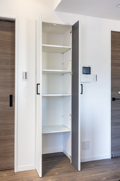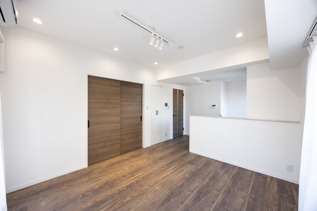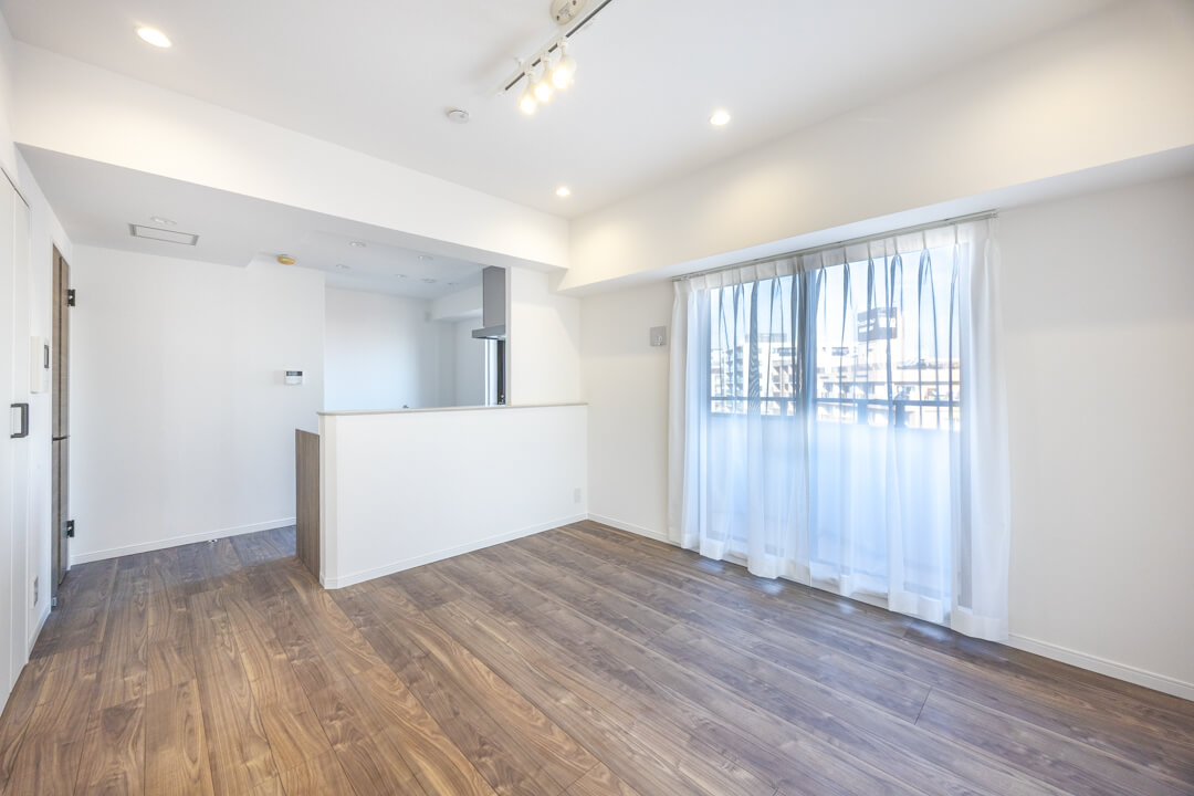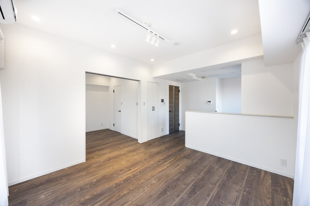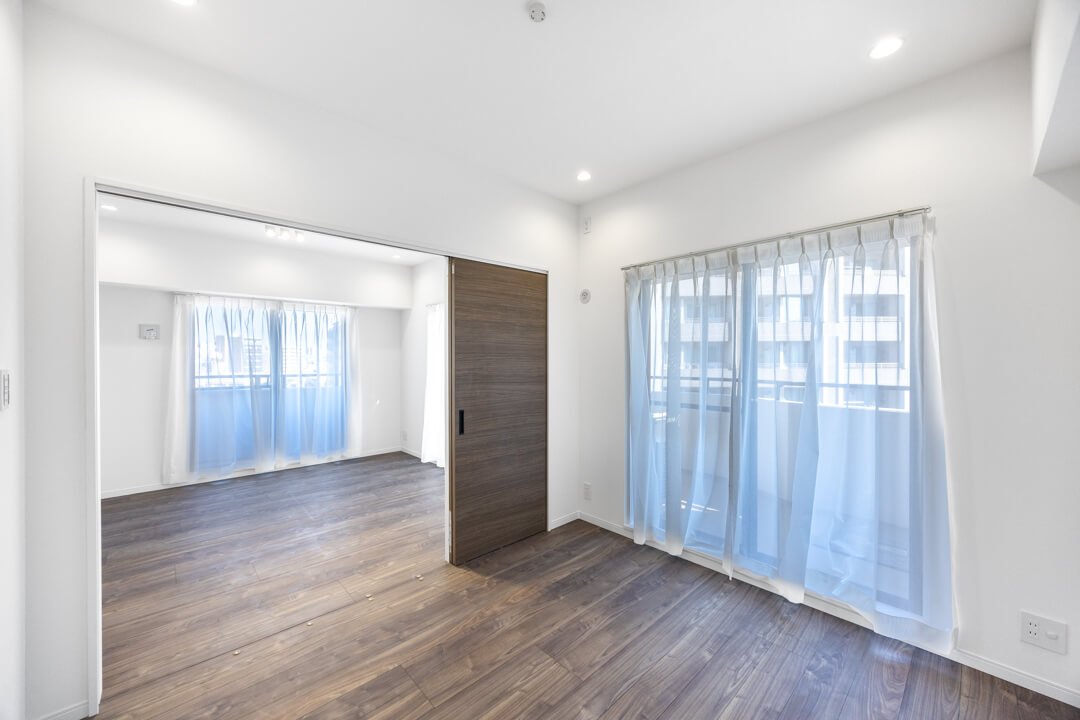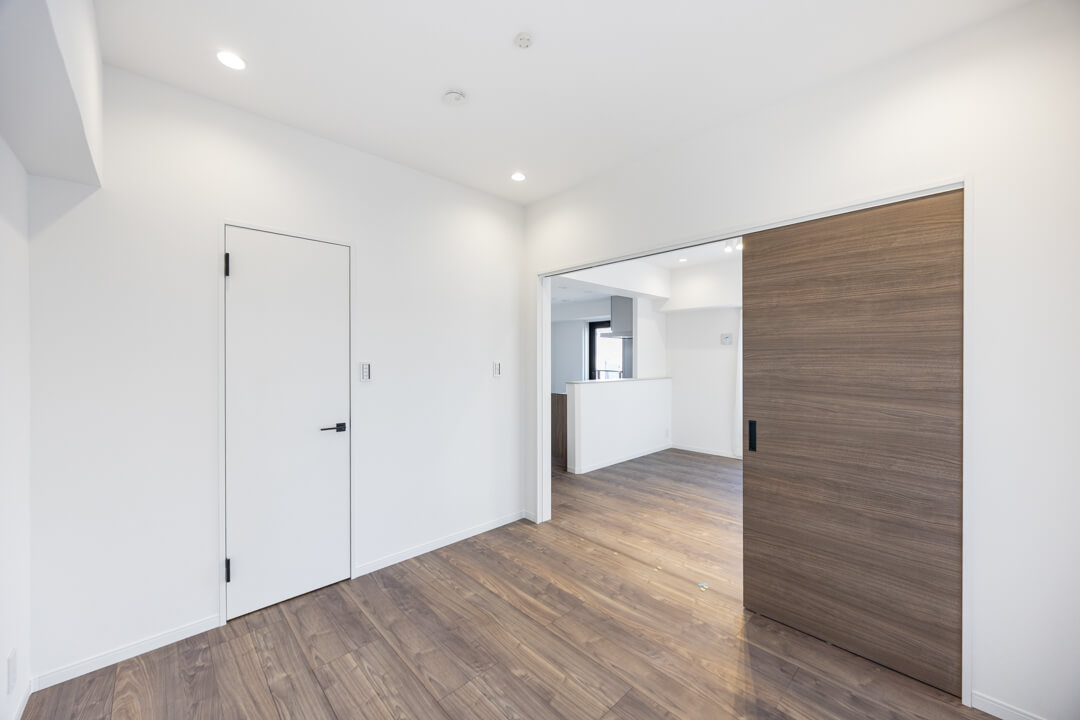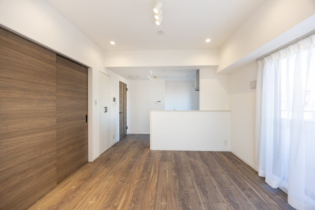 キッチンスペースを含め、約12.10㎡のLDK。リビングと隣接した洋室と繋げてより広々過ごせます。床にドアレールがないので見た目もすっきりとした印象。レールにホコリがたまる心配もないので衛生的にも◎です。二面採光で開放感もたっぷり。自然な光も入ります。リビングの一角には収納スペースも設けられています。
