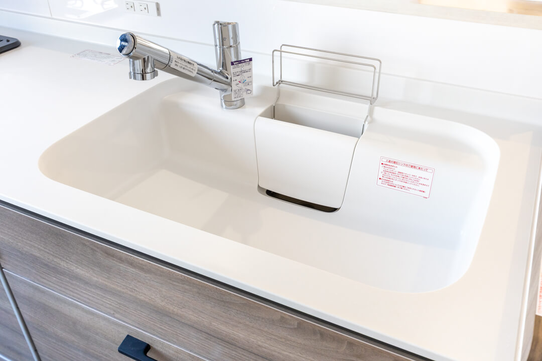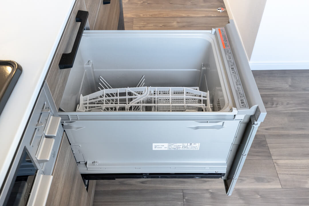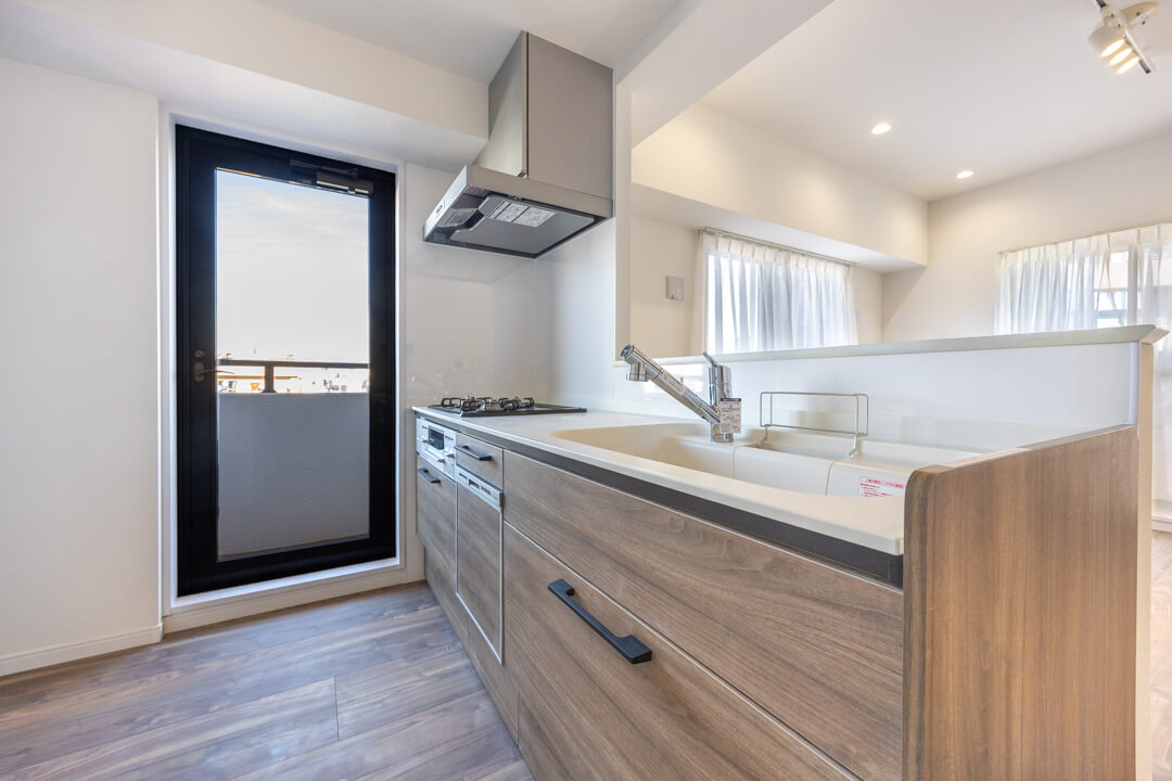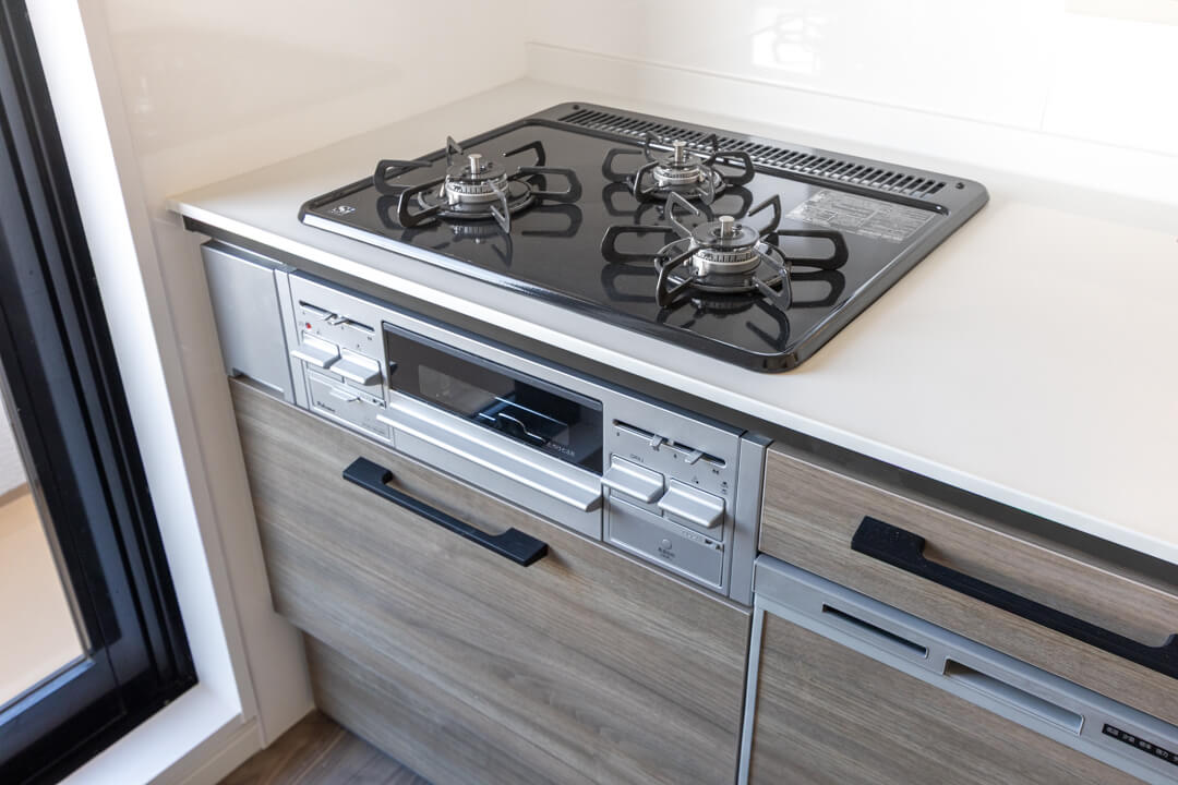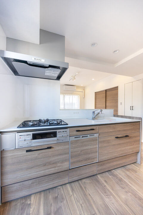 リビングが見渡せる開放的な対面型キッチン。家族やゲストと会話がしやすく、小さなお子さんがいるご家庭では子どもの姿も見守れます。料理が捗る3口ガスコンロ、家事の時短に心強い食洗機付き。勝手口からバルコニーへの出入りも可能です。
