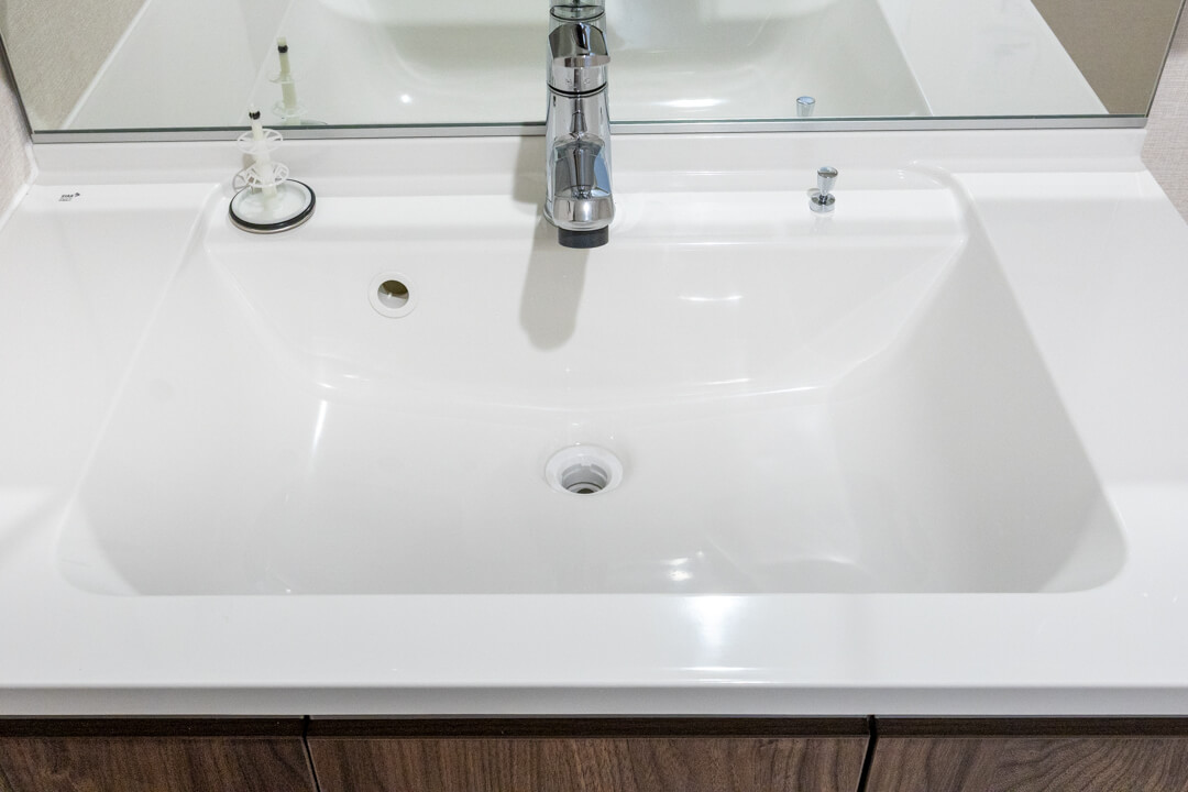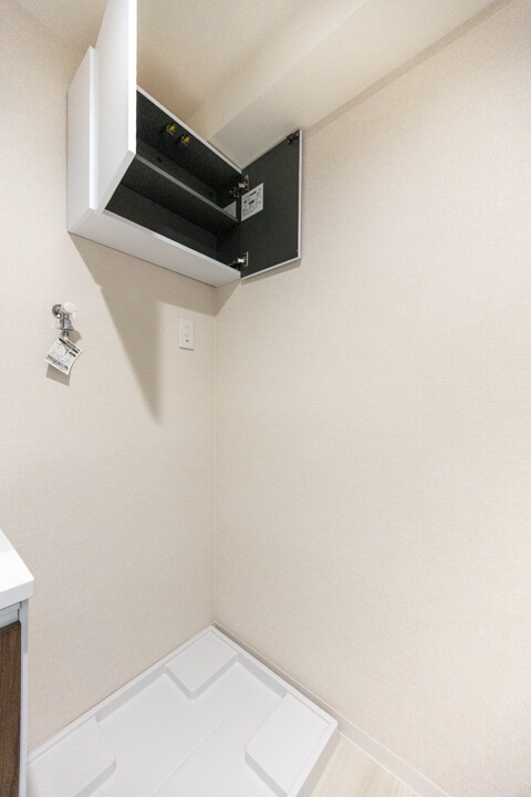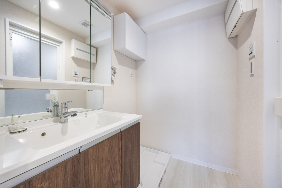 洗面化粧台は洗面まわりの小物がすっきり整頓できるミラーボックス付きで、いつでも整った状態をキープでいそうですね。洗濯機置き場の上部にも収納スペースが設けられています。