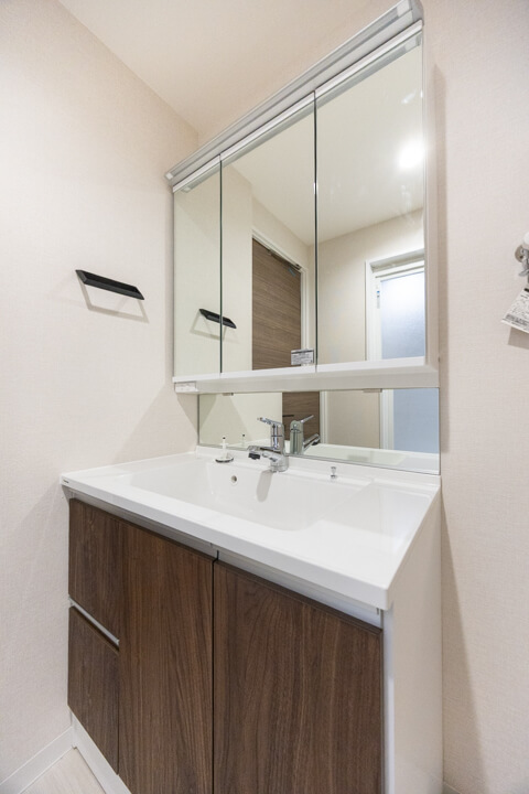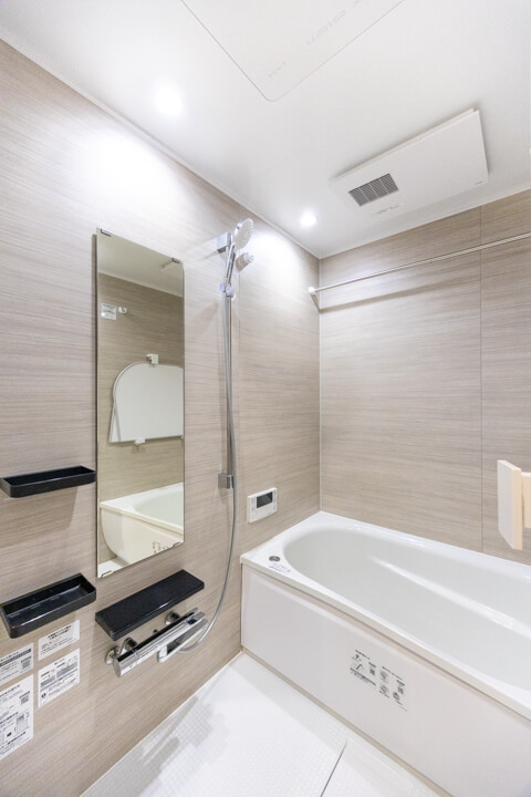 ウッド調であたたかみのある雰囲気のバスルーム。追い炊き機能の他、衣類乾燥・換気・暖房・涼風の4つの機能が備わっていて、一年中快適にバスタイムが楽しめます。ランドリーパイプも設置されていて雨の日や冬場の洗濯にも困りません。