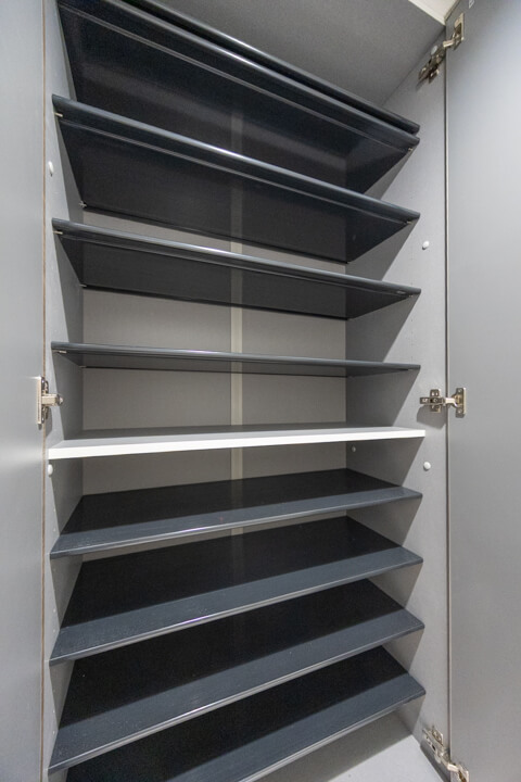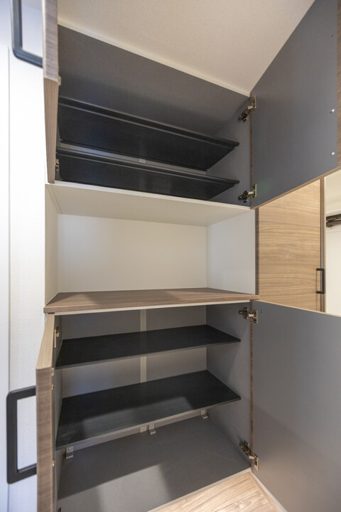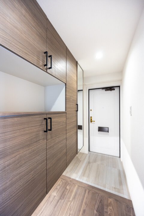 玄関には大容量のシューズボックスを完備。カウンター付きでアートや季節の花を飾って玄関に彩りをプラスできます。扉の一面が姿見になっているので、お出かけ前の身だしなみチェックもできます。また、廊下にも収納スペースが備わっています。