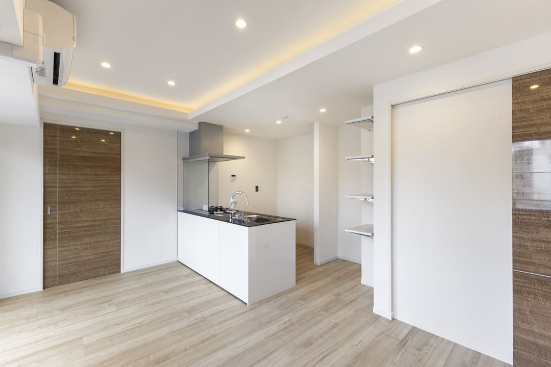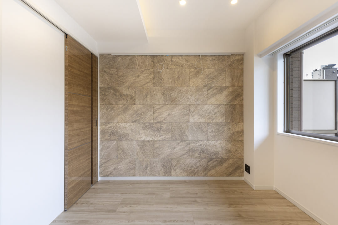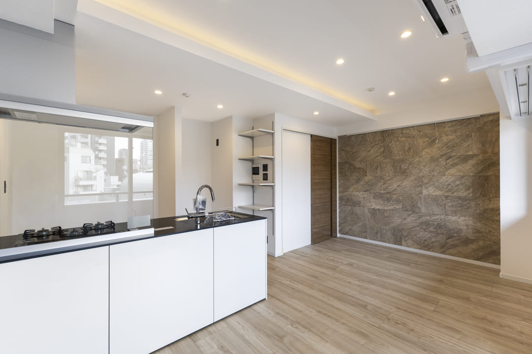約11.5帖のLDK。西側に窓が並び、明るく風通し良好です。温もりある木目フローリングに石調のアクセントウォールが映え、上質な空間を演出。やわらかな光の間接照明も魅力で、穏やかなグラデーションがリラックスタイムへと誘います。