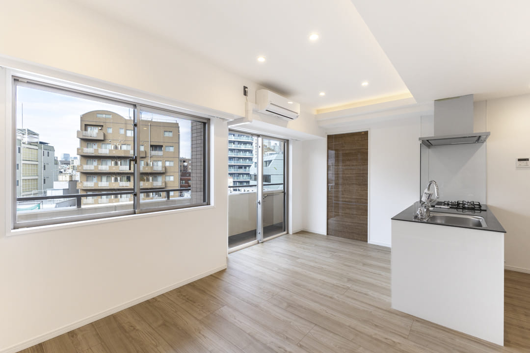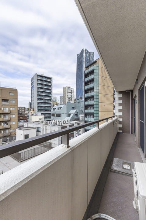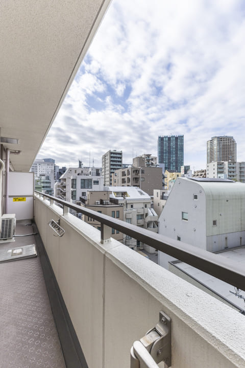 LDKと洋室に跨るワイドスパンバルコニー。8.02㎡です。都会でありながら周辺には低層の建物も多く、遠く広がる青空を見上げることができます。