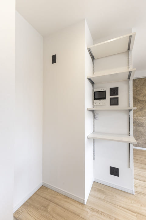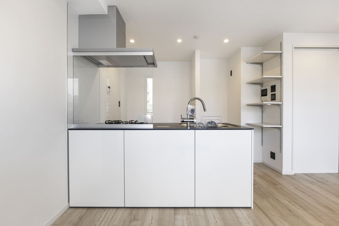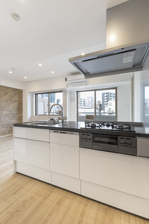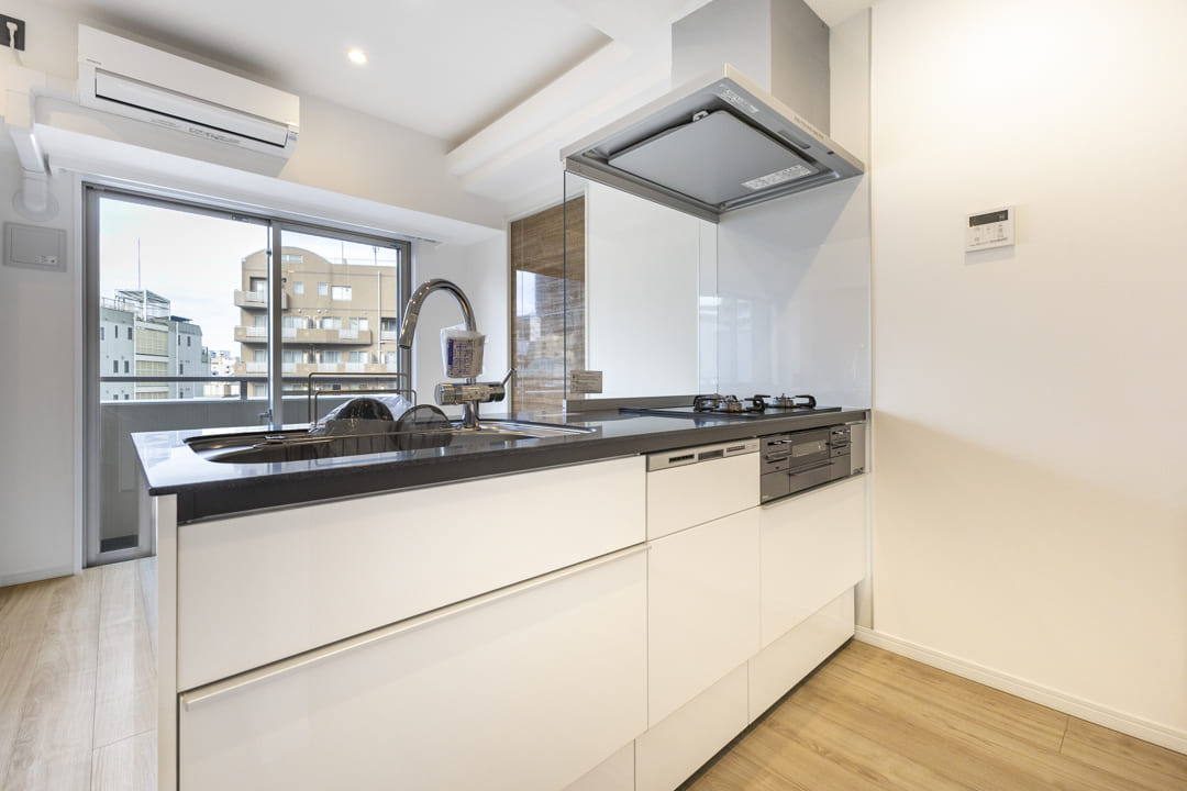 白と黒のコントラストが美しい、スタイリッシュなキッチン。開放的に調理ができる対面タイプです。パートナーやゲストとの会話も弾みそうですね。コンロ前にはガラスパネルが設置されていて、開放感を確保しながら、リビング側への油跳ねを防ぐことができます。