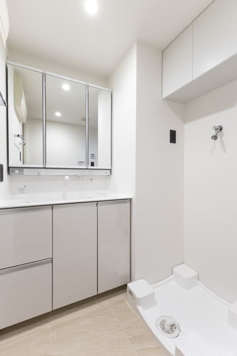 白基調で清潔感のある洗面化粧台。大きな三面鏡付きで身だしなみを整えるのに便利です。大開口の洗面ボウルは、カウンターと一体成型でお手入れ簡単。上部から吐水する水栓を採用しており、水栓まわりに水が溜まりにくい点も嬉しいポイントです。