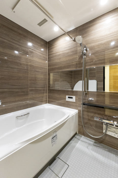 光沢のある木目柄パネルとワイドミラーが、上質で落ち着く雰囲気を演出するバスルーム。1218サイズです。追い焚き機能搭載で、ゆっくり半身浴をお楽しみいただけます。寒い日も快適に入浴でき、カビ対策や雨の日のお洗濯にも活躍する浴室換気乾燥暖房機も完備しています。