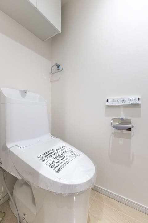 廊下に面していて独立性の高いレストルーム。LIXIL製の洗浄機能付トイレに交換済みです。吊戸棚はトイレットペーパーや掃除用品の収納に便利。扉付きなので、生活感を隠せて嬉しいですね。