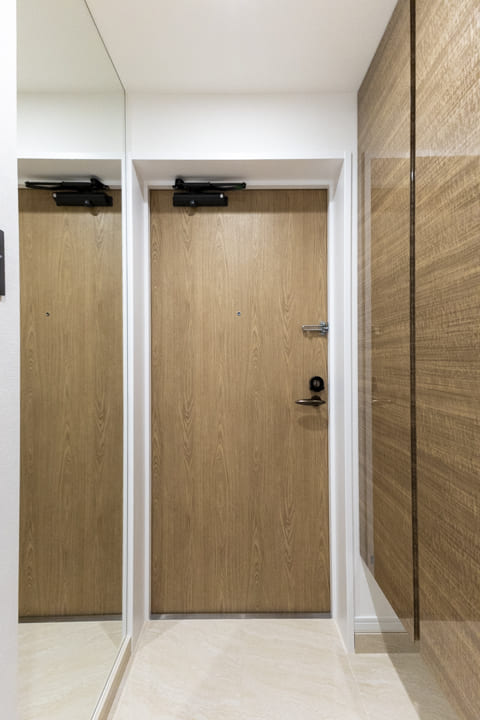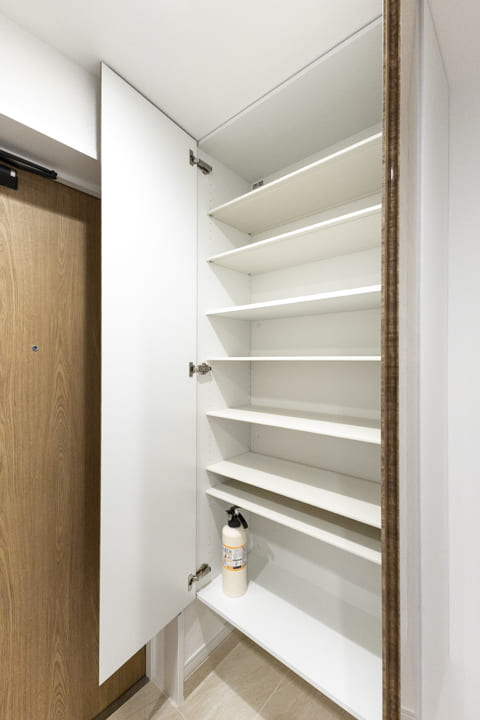 鏡張りで奥行きを感じる玄関。靴を履いた状態でコーディネートチェックできるのも嬉しいポイントです。対面側には収納力のあるシューズボックスを備え、散らかりがちな靴をすっきり収納できます。