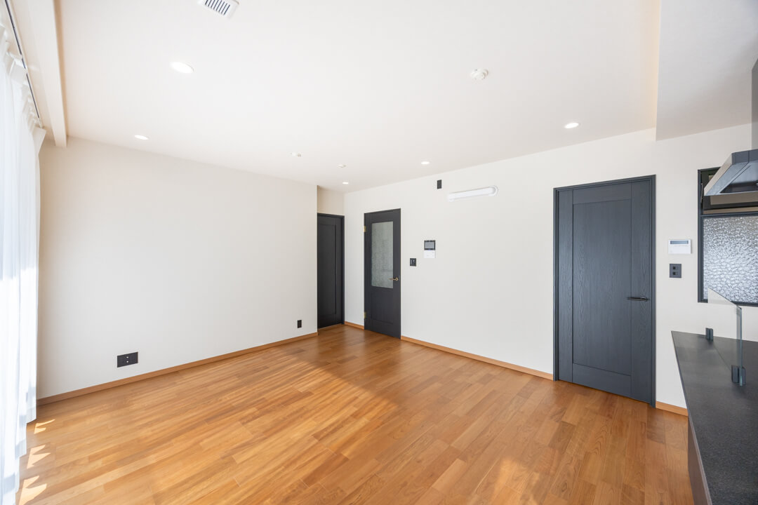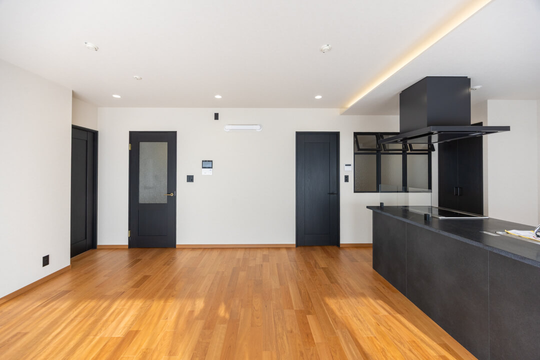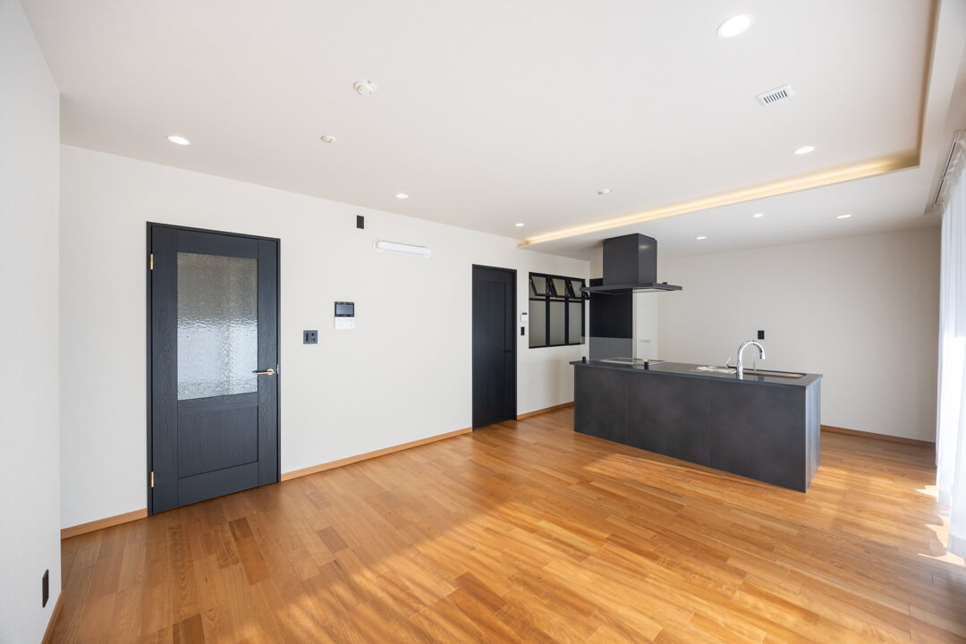 キッチンスペースを含め、約16.5帖のLDK。ブラックをアクセントカラーとした内装デザインです。窓面積が広く開放感たっぷりで、南西向きにつき陽当りも良好。天井には間接照明が施されていて、空間をやさしい光で照らしてくれます。また、インテリアのアクセントにもなる室内窓は洋室(約5.6帖)に面しています。
