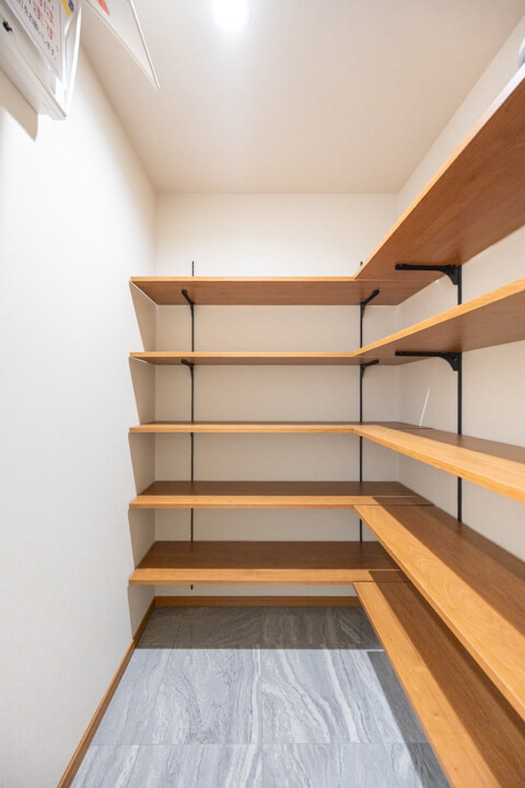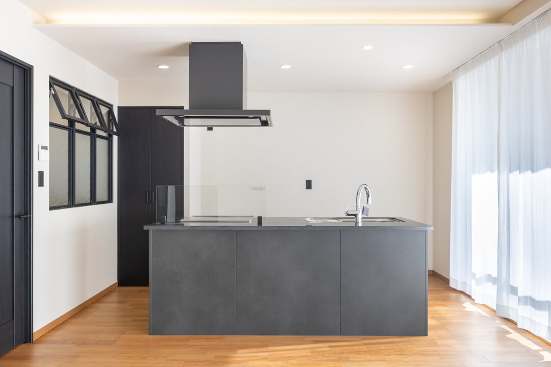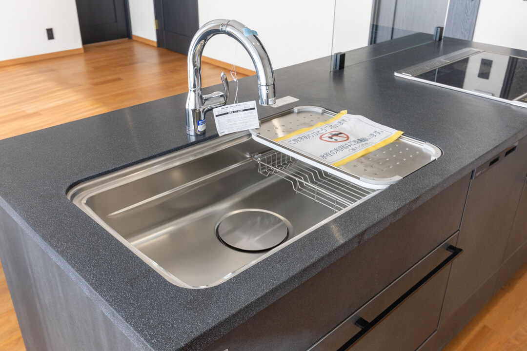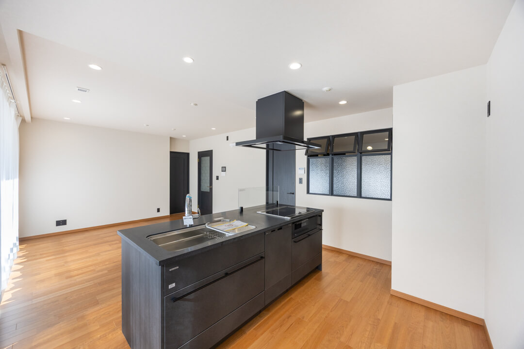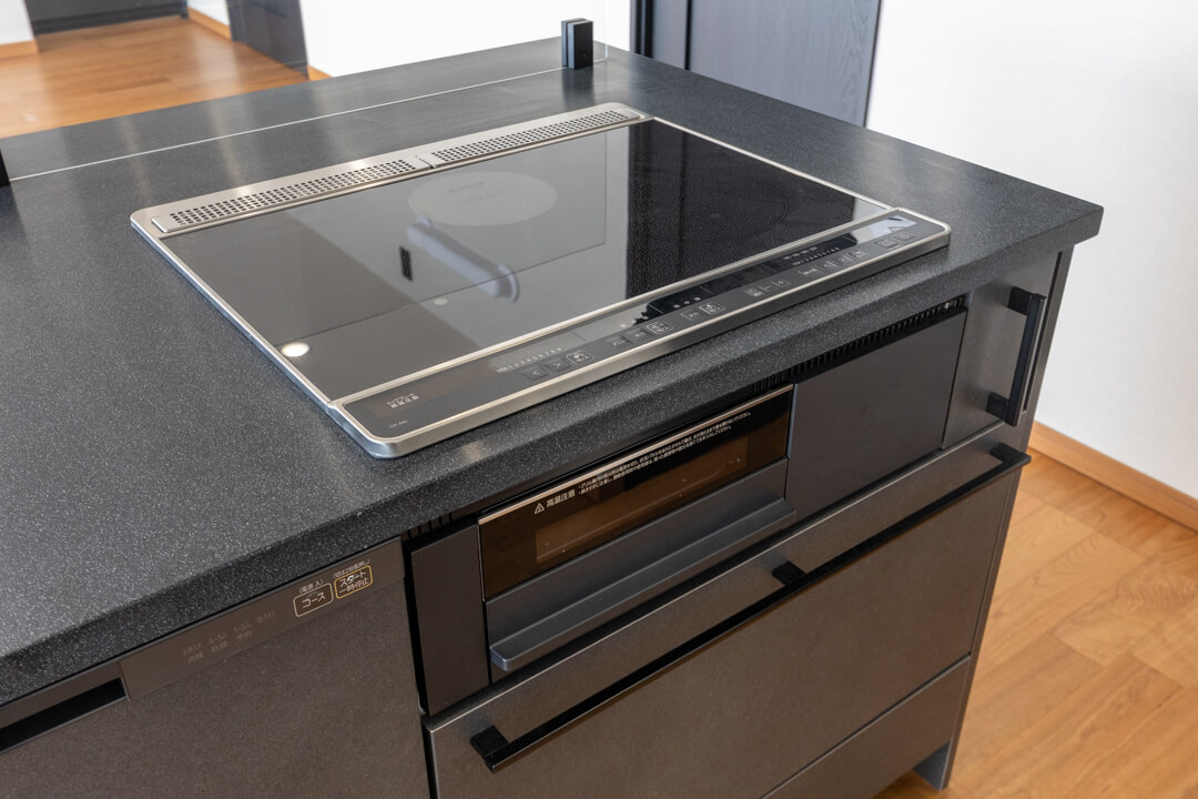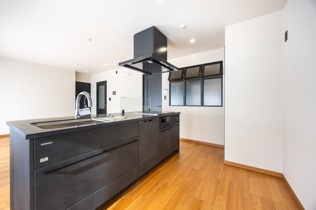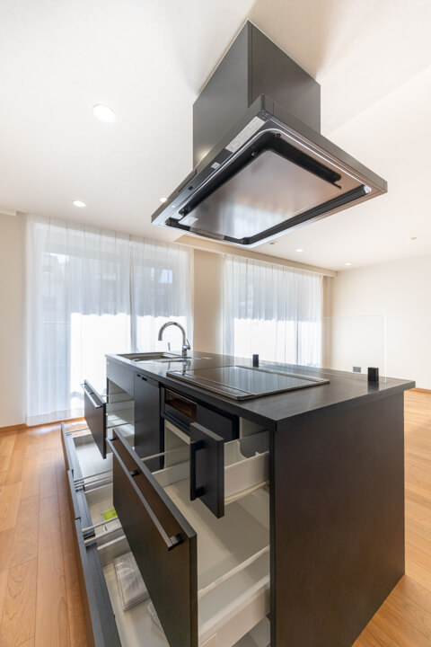 リビングダイニングが見渡せる開放的なアイランドキッチン。左右どちらからでも通れる便利な動線がポイントです。家族やゲストと会話がしやすく、小さなお子さんがいるご家庭では子どもの姿も見守れます。浄水器付きの水栓、手入れが楽なIHクッキングヒーター、家事の時短に心強い食洗機付きで設備も充実。キッチン背面にはパントリーとして使える収納庫も備わっています。