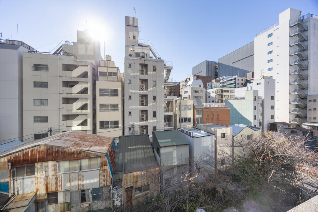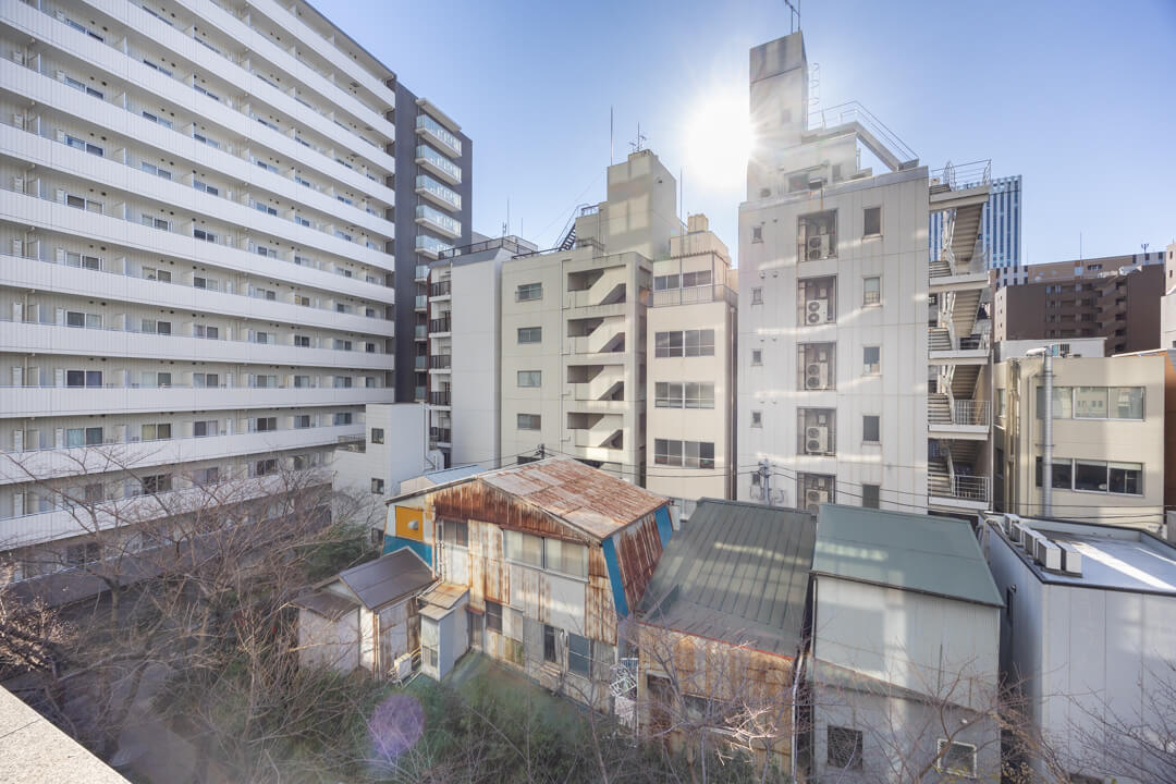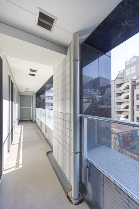 LDKと洋室(約7.7帖)に面したワイドスパンバルコニー。約12㎡ほどのゆとりある広さで、南西向きで陽当りも良好です。バルコニー目の前の建物とは距離が保たれているので、見晴らしが良くなっています。