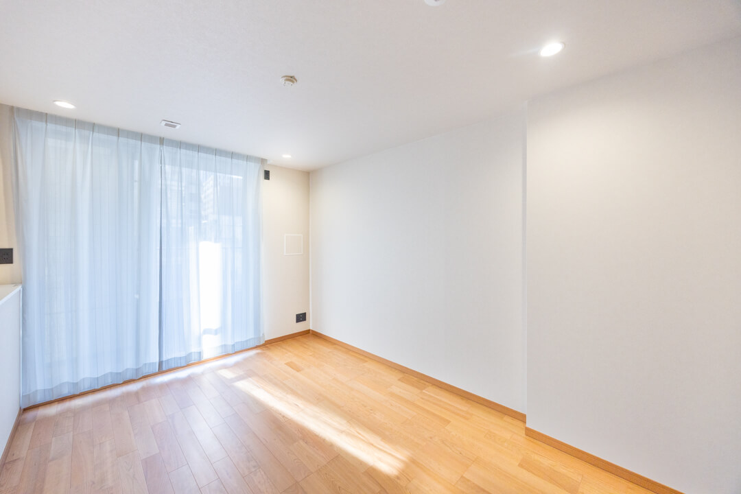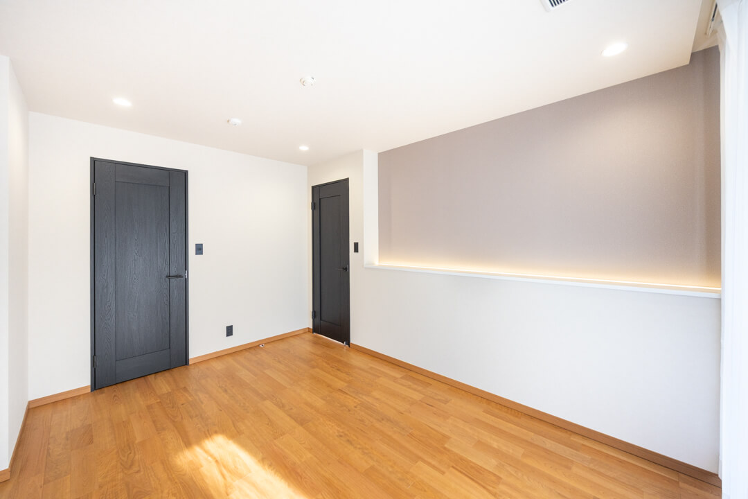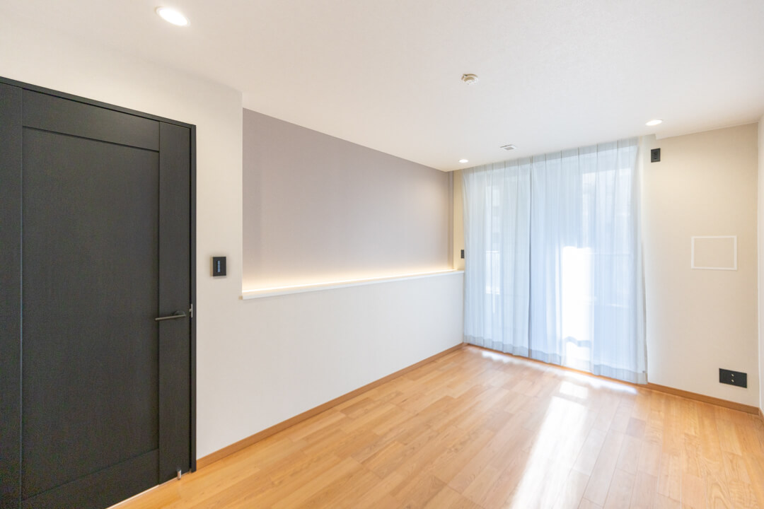 約7.7帖の洋室はリビングから直接出入りできる動線で、家族とのコミュニケーションが取りやすくなっています。南西向きで陽当りも良好。バルコニーへの出入りも可能です。間接照明付きのカウンターが設けられていて、ベッドまわりの演出性も高まりそうですね。
