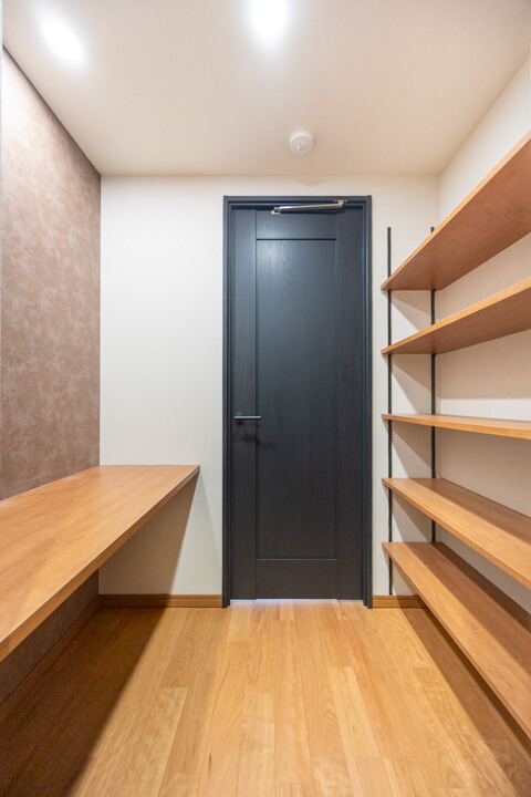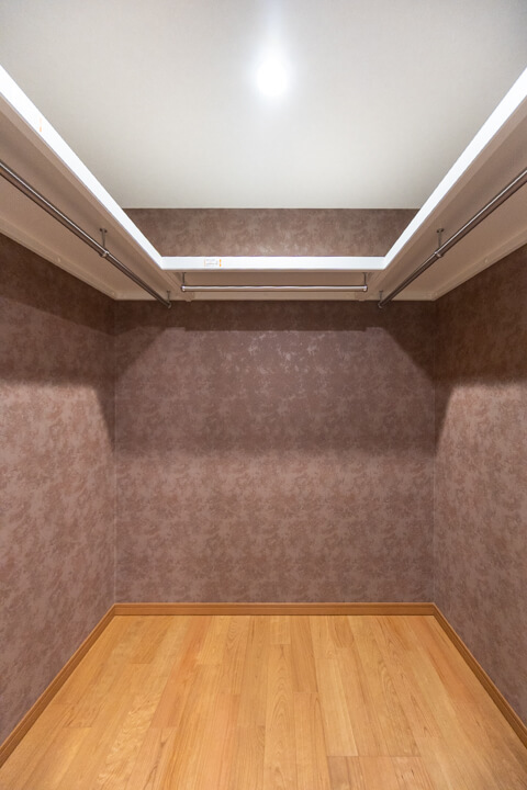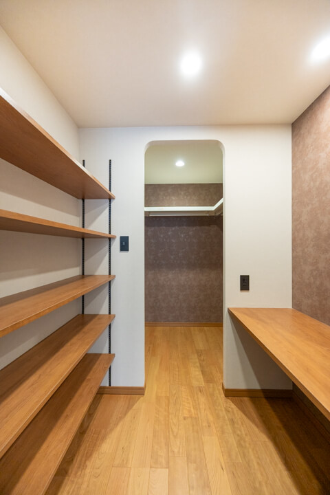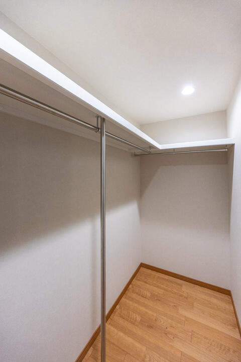 WIC(ウォークインクローゼット)と書斎が設けられています。WICは3方向にハンガーパイプが付いた奥行きのある広さで洋服がたっぷりと収納できます。書斎にはデスクカウンターが付いていてイスを置いてワークスペースやちょっとした作業スペースに便利な空間。可動棚も付いています。