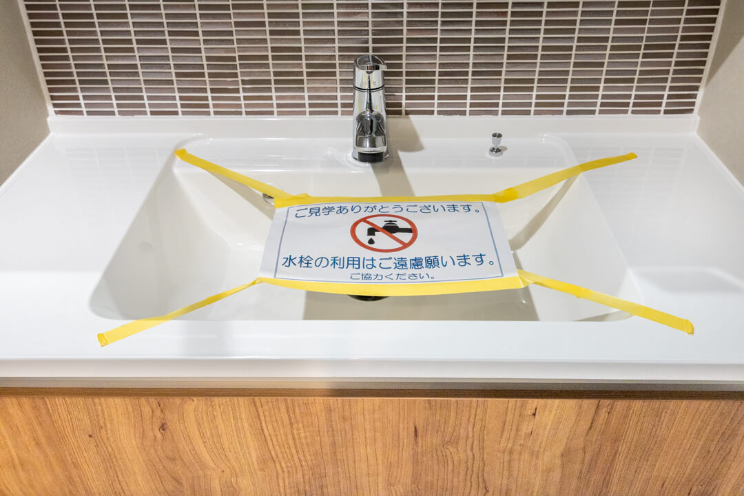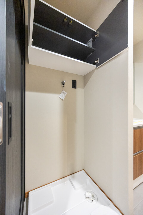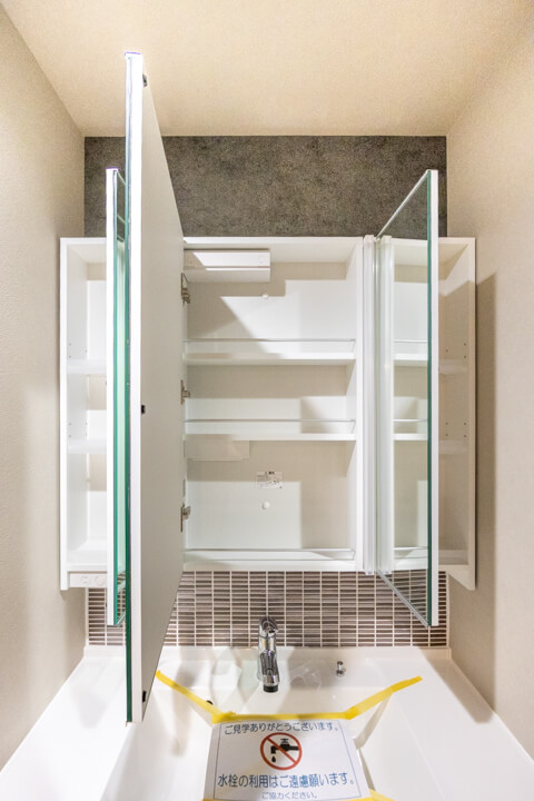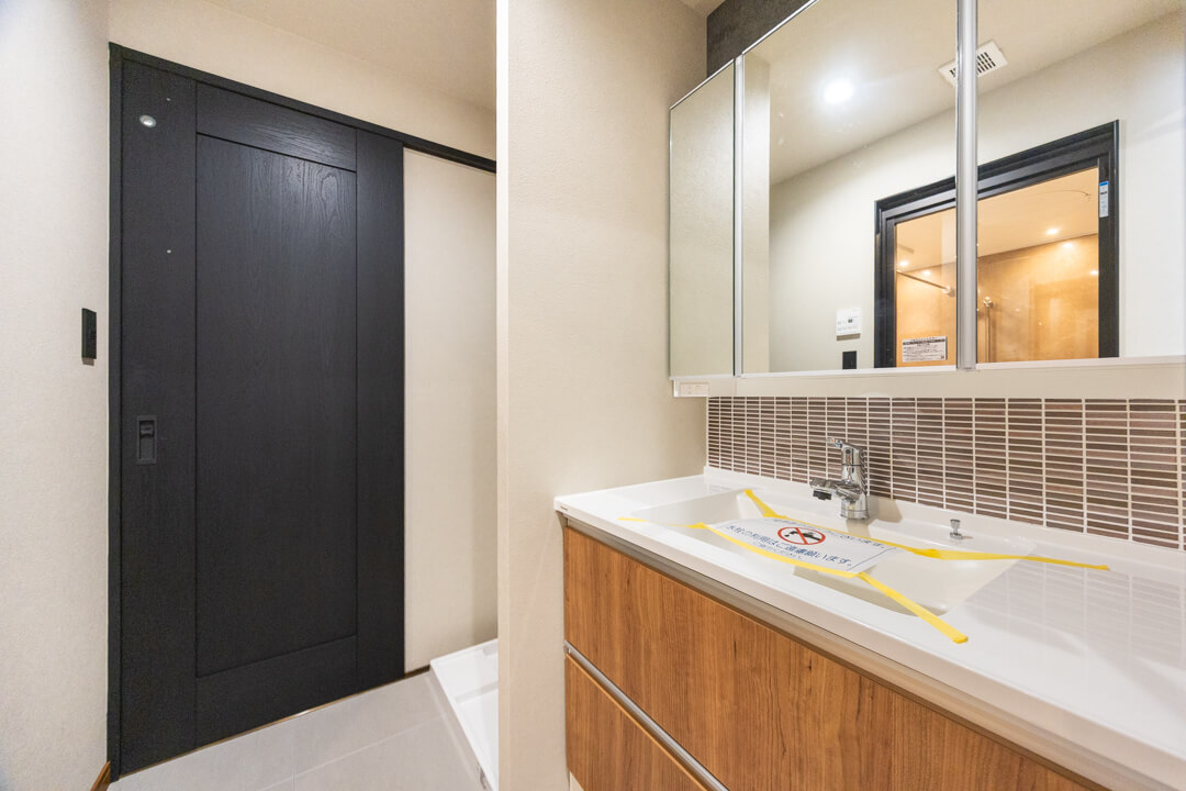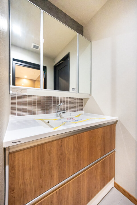 廊下と洋室(約5.6帖)の2方向から出入りできる洗面室。タイル使いがお洒落な洗面化粧台で、洗面まわりの小物がすっきり整頓できるミラーボックスや、モノの出し入れがしやすい引き出し式のキャビネット付きで使い勝手の良さもポイントです。
