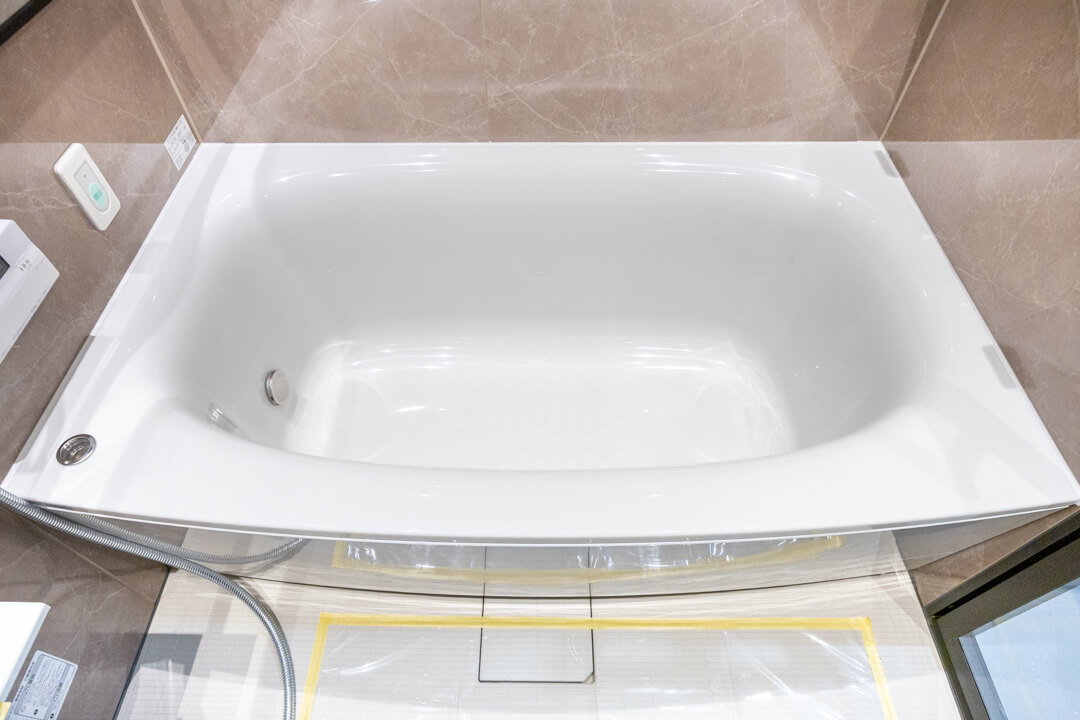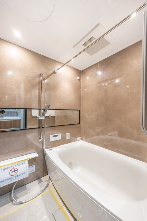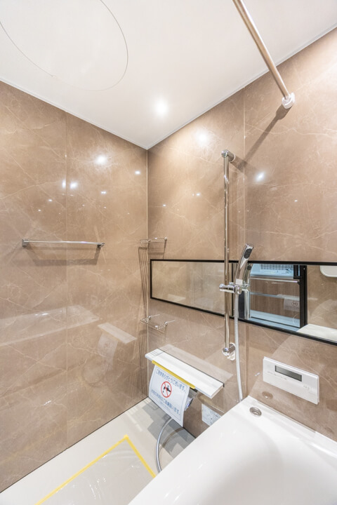 1416サイズのバスルーム。追い炊き機能の他、乾燥・換気・暖房・涼風の4つの機能が備わっていて一年中快適にバスタイムが楽しめます。ランドリーパイプも付いていて雨の日や冬場の洗濯にも困りません。