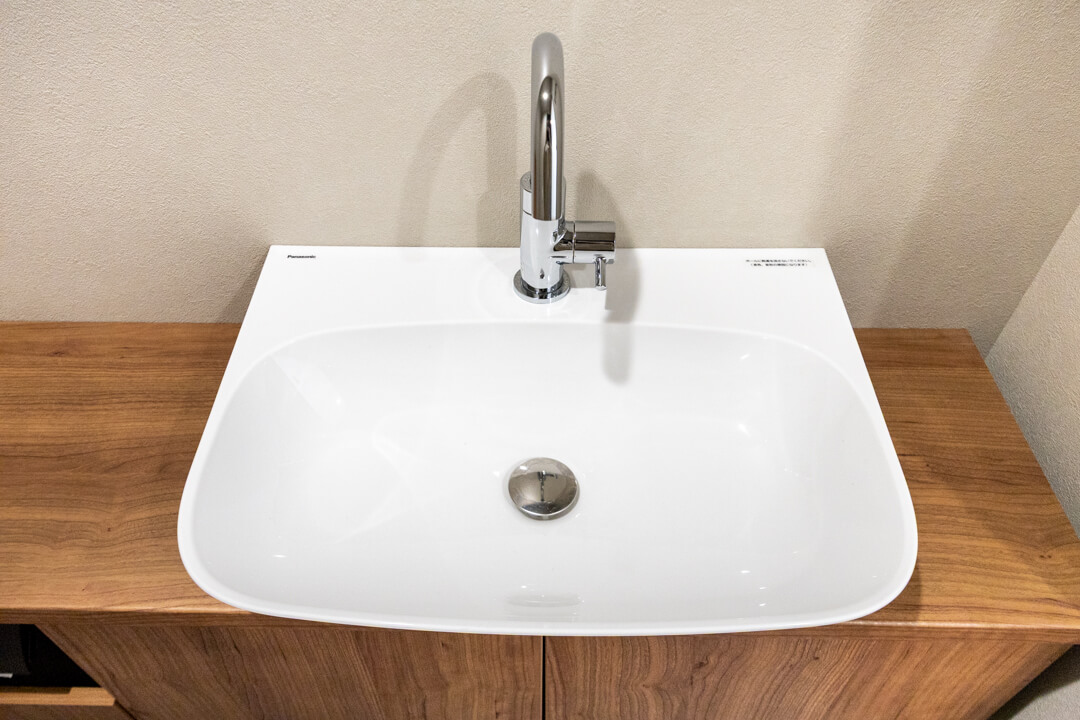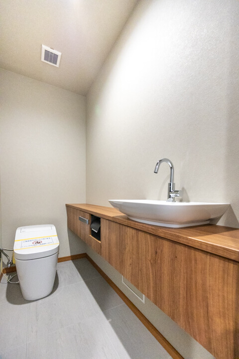 廊下に面したレストルーム。空間がすっきり見えるタンクレストイレです。手洗いカウンター、ウォシュレットも備わっています。