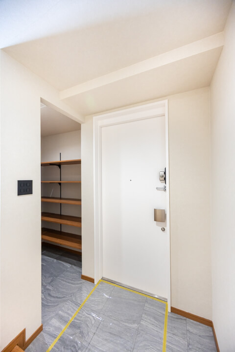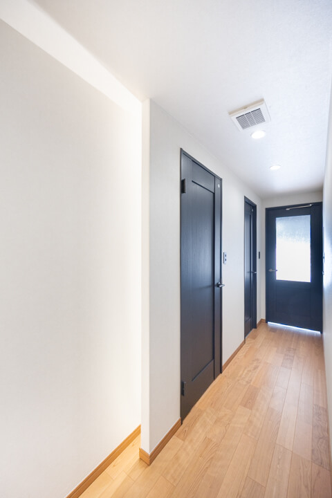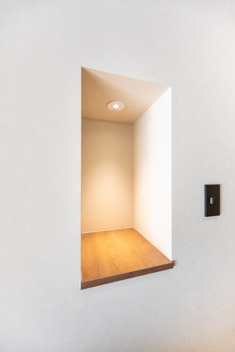 玄関にはSIC(シューズインクローゼット)を完備。たくさんの靴はもちろん、スポーツ用品なども収納できる広さです。扉レスなのでベビーカーなどもスムーズに出し入れできそうですね。また、廊下にはアートや季節の花が飾れるニッチが設けられていて、空間に彩りをプラスできます。