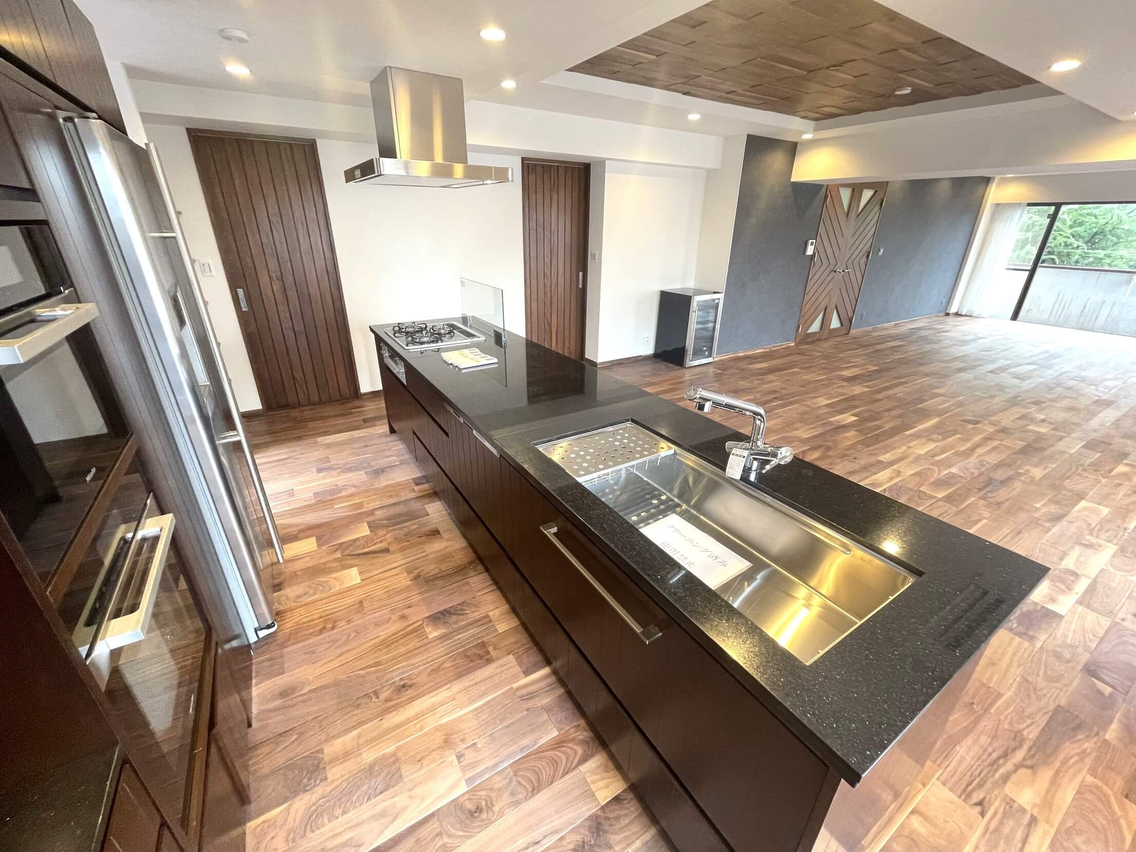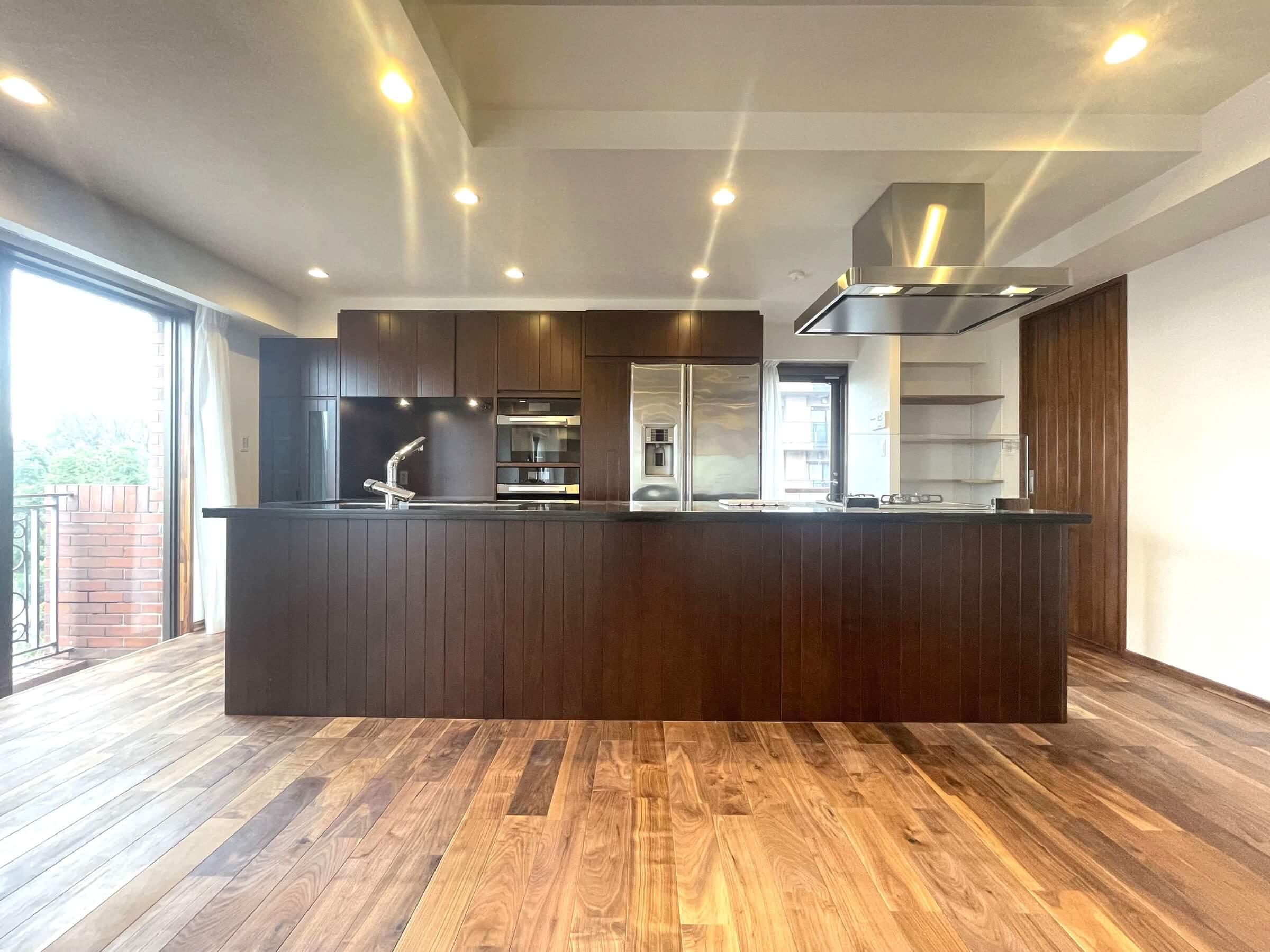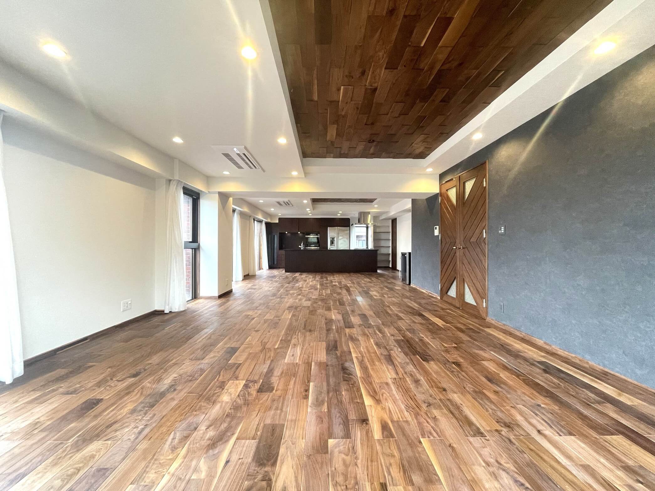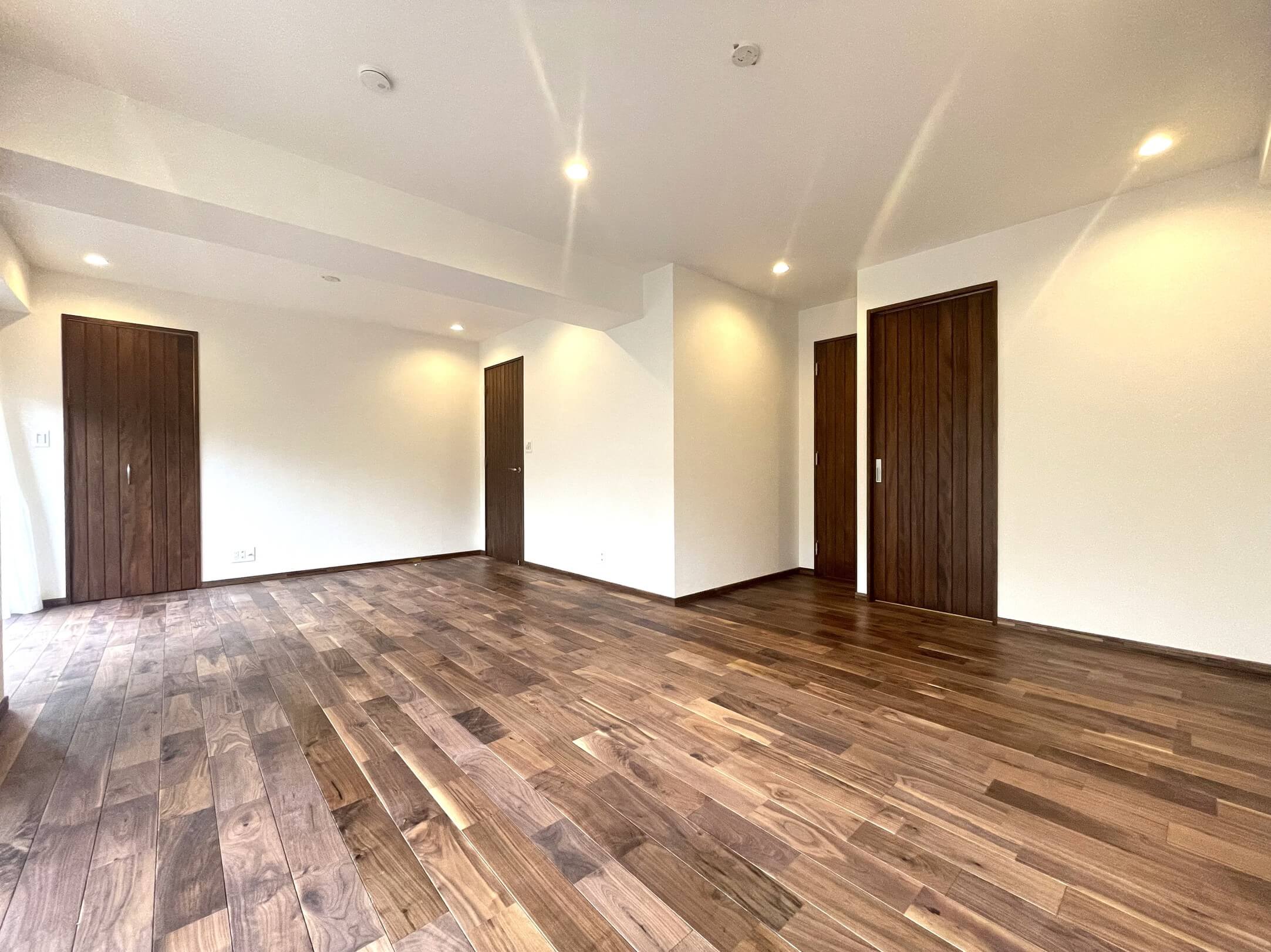約40.0帖の開放感溢れるLDK。天然無垢のウォルナット材をふんだんに使用し、木の温もりと重厚感を感じる内装です。南東・南西・北西向きの3面採光で、日当たり・風通し良好◎。明るい光と心地よい風を感じ、家族団らんのリラックスタイムをお過ごしいただけます。
