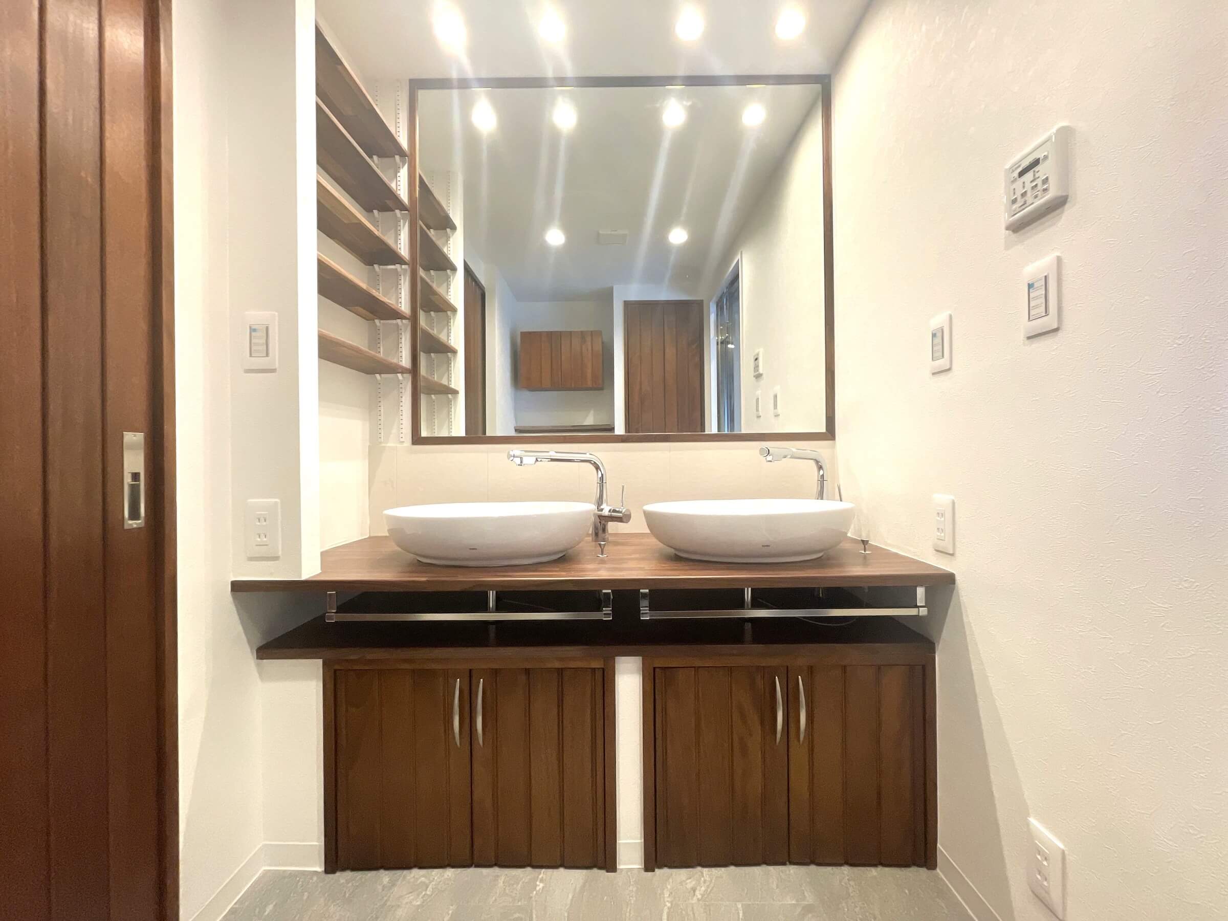 大きな一面鏡が特徴的な洗面化粧台。2つの洗面ボウルが並び、2人同時に使用できます。忙しい朝の身支度も安心ですね。壁面の可動棚やカウンター下のタオル掛けなど、作業動線が考えられた設計が魅力。背面にはリネン庫があり、収納スペースも充実しています。