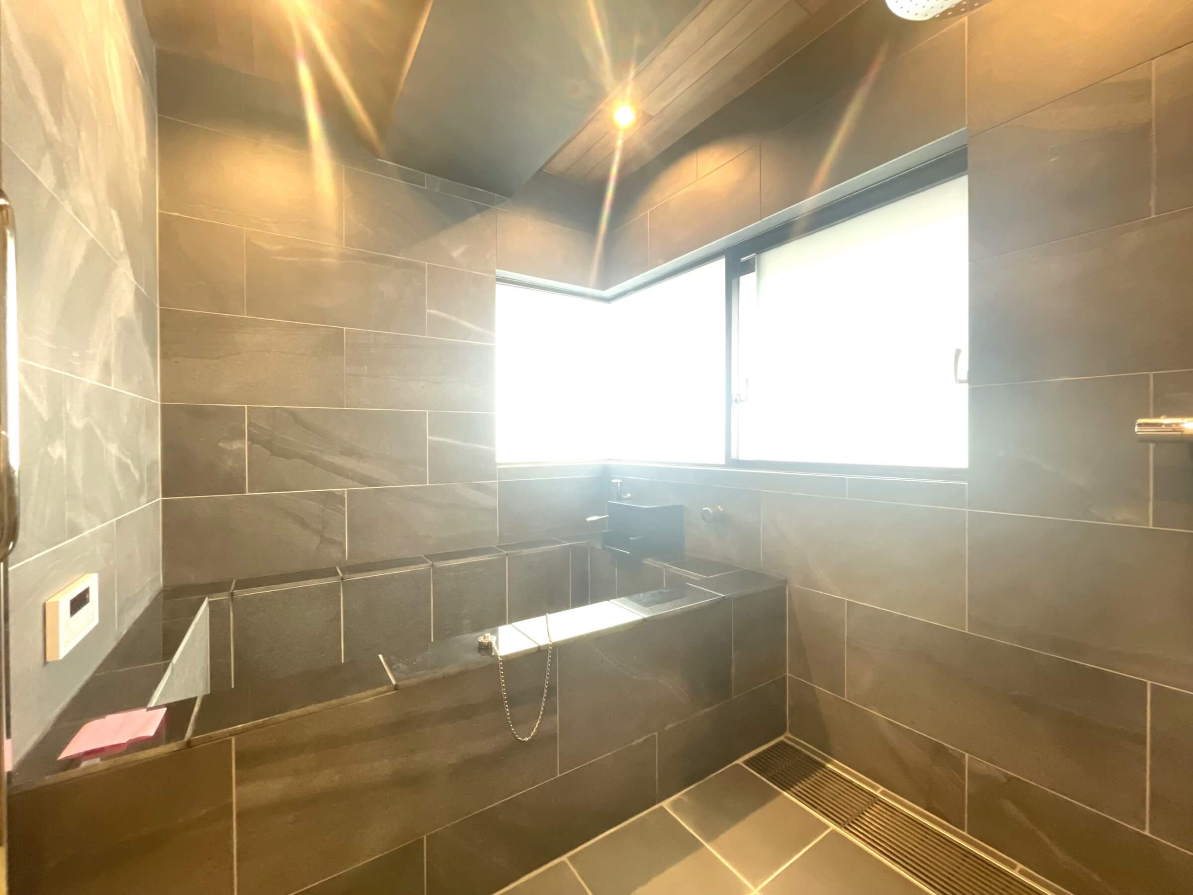 大きなコーナー窓付きで、開放感溢れるバスルーム。ストーン調のシックな内装の在来浴室です。浴室換気乾燥機付きで、1年中快適なバスタイムをお過ごしいただけます。